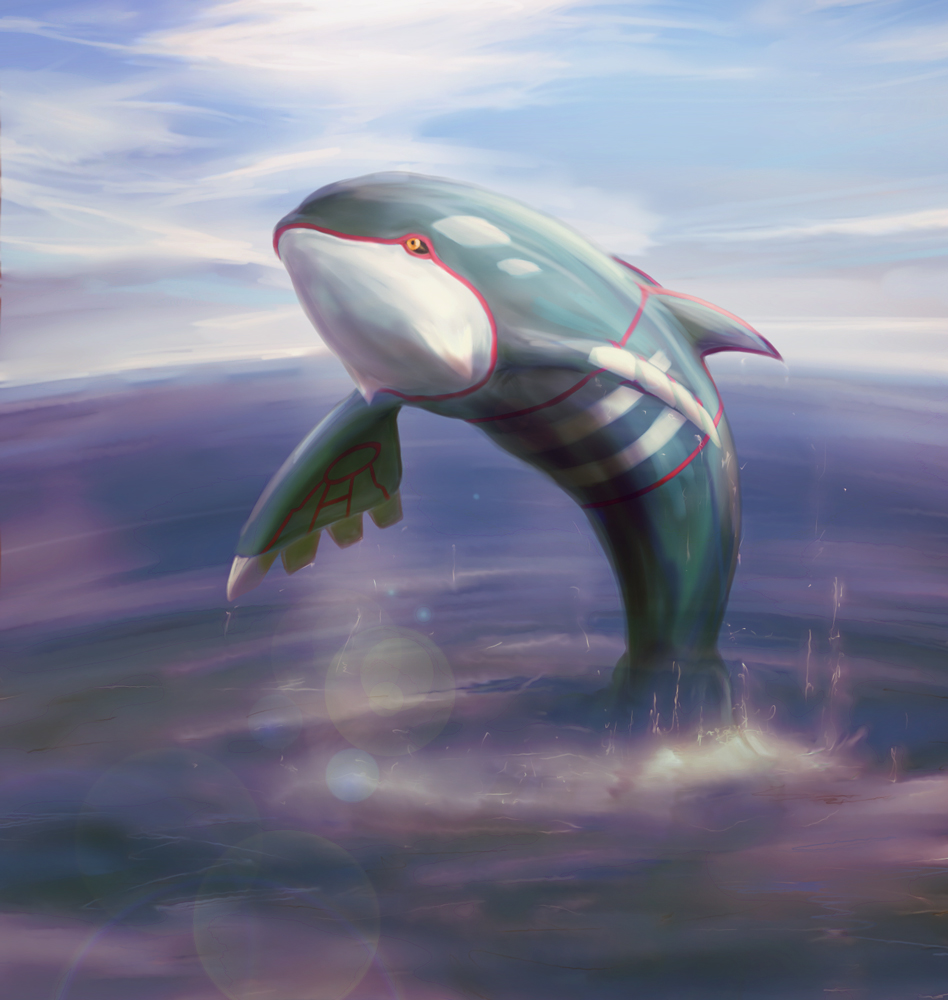 00s cloud gen_3_pokemon kyogre legendary_pokemon lens_flare nature nintendo no_humans ocean pokemon pokemon_(creature) pokemon_ruby/sapphire/emerald scenery serene_(gusarme) sky solo splashing water whale