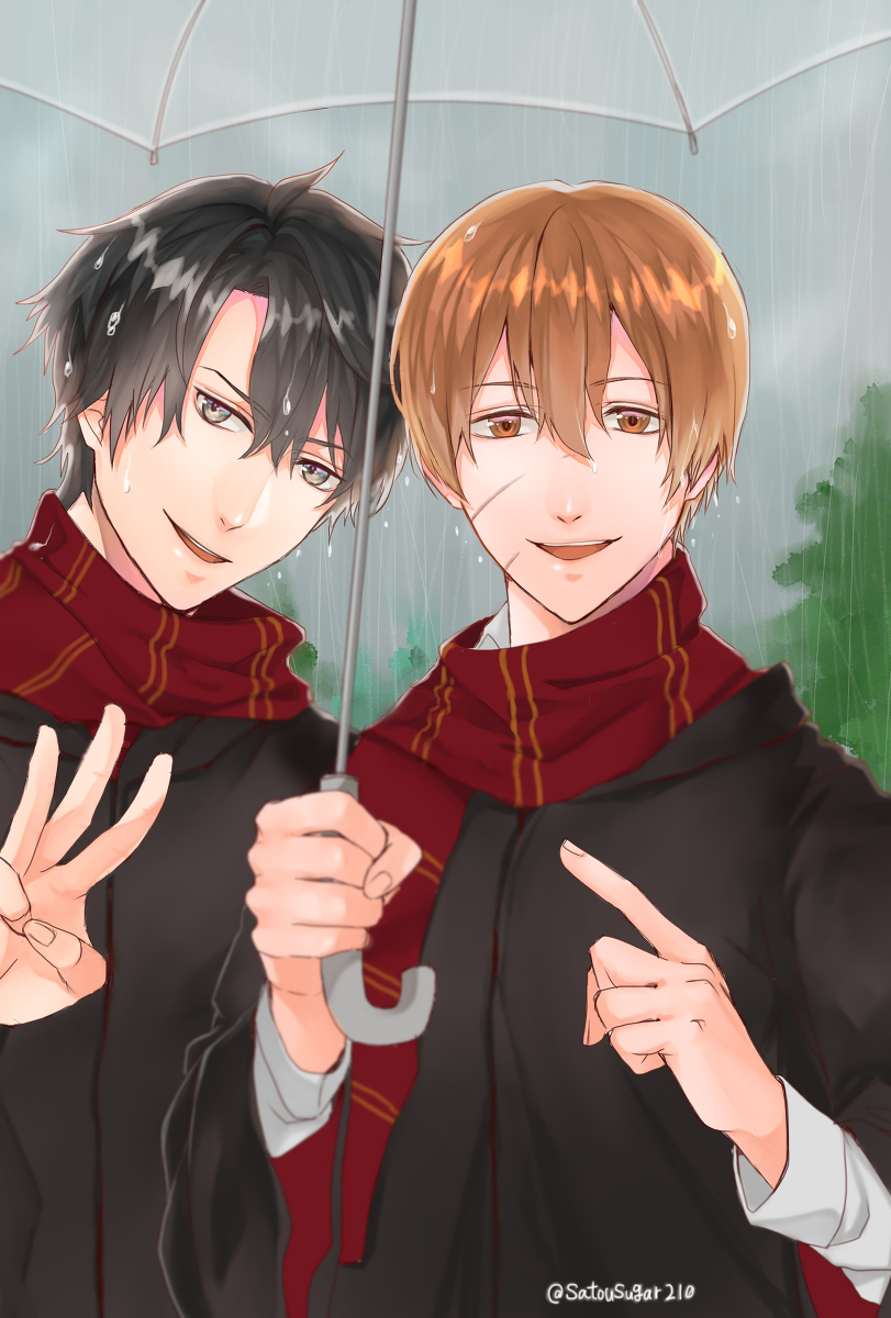 2boys black_hair black_robe brown_eyes brown_hair cloud cloudy_sky collar facial_scar grey_eyes hair_between_eyes hand_up harry_potter_(series) highres holding holding_umbrella looking_at_viewer male_focus multiple_boys outdoors parted_lips rain remus_lupin robe satousugar210 scar scar_on_cheek scar_on_face scarf school_uniform short_hair sirius_black sky striped_clothes striped_scarf teeth tree twitter_username umbrella wet wet_hair wing_collar wizarding_world