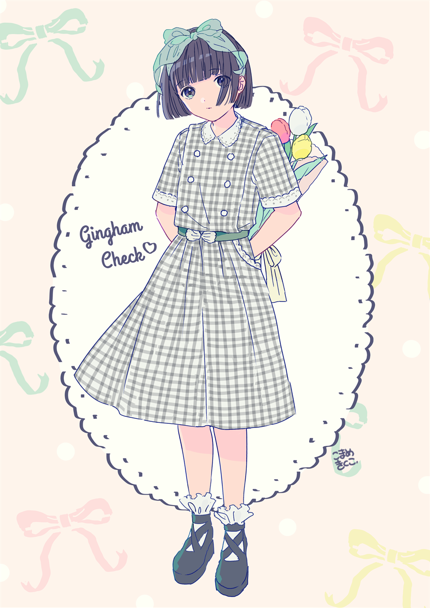 1girl arms_behind_back artist_name belt black_hair blue_eyes border bouquet bow collared_dress dress female_focus flower frilled_shirt_collar frills full_body gingham_clothes gingham_dress hair_bow highres holding holding_flower looking_at_viewer mosuko original outside_border patterned_background short_hair short_sleeves solo tulip