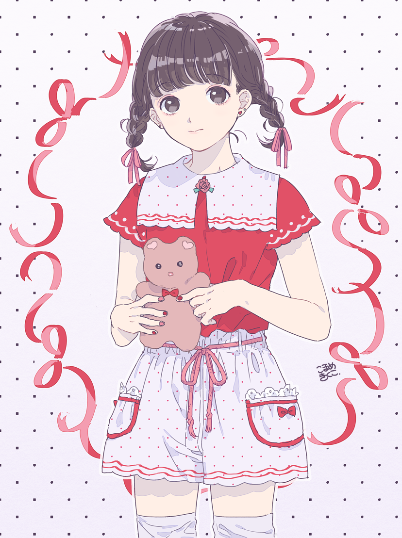 1girl blunt_bangs braid brown_eyes brown_hair child cowboy_shot drawstring ear_piercing earrings hair_ribbon heart heart_earrings holding holding_stuffed_toy jewelry mosuko nail_polish original piercing pink_nails pocket polka_dot red_nails ribbon shirt short_hair shorts stuffed_animal stuffed_toy teddy_bear thighhighs twin_braids