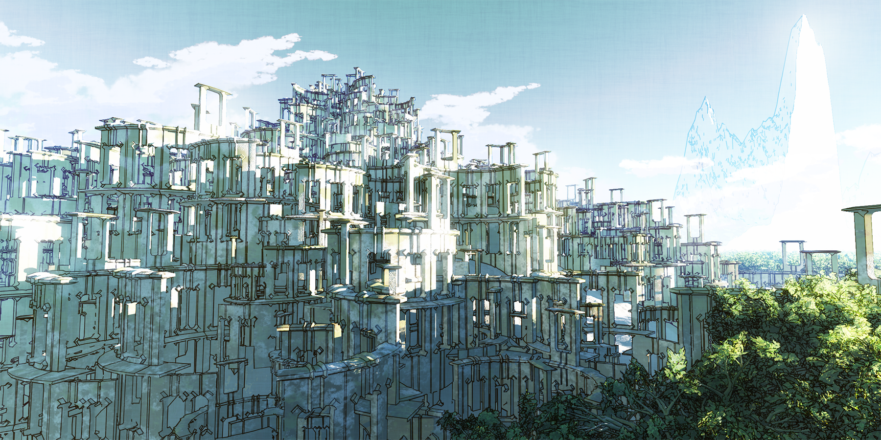 blue_sky building cloud day highres mountain no_humans original outdoors scenery sky sunlight tree waisshu_(sougyokyuu)