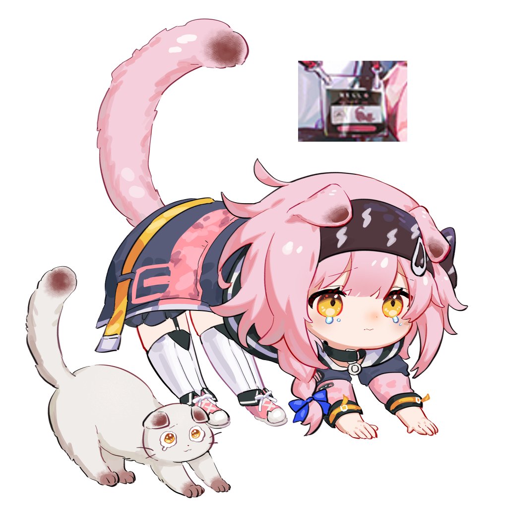 1girl all_fours animal arknights black_hair blue_bow blue_jacket bow braid cat chibi commentary crying crying_with_eyes_open downward_dog floppy_ears goldenglow_(arknights) hair_bow hair_ornament hairclip imitating jacket lightning_bolt_print long_hair multicolored_jacket pink_hair pink_jacket pink_shoes scottish_fold screenshot_inset shoes solo spacelongcat stretching tears thighhighs two-tone_jacket white_thighhighs yellow_eyes
