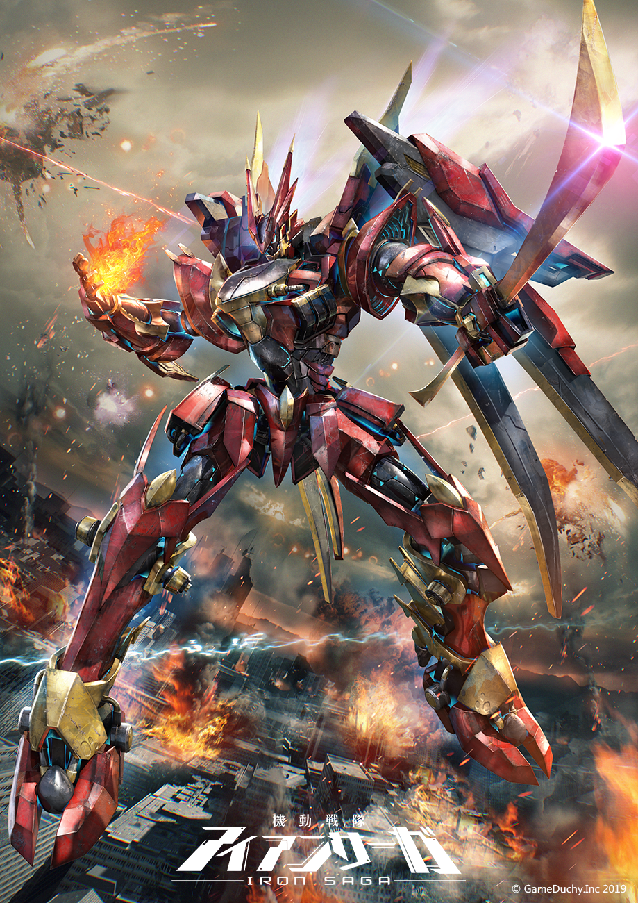 copyright_name double_blade electricity explosion highres holding holding_sword holding_weapon iron_saga logo mecha mephisto_(iron_saga) official_art open_hand robot science_fiction smoke solo sword tani_(tanidesuyo) weapon