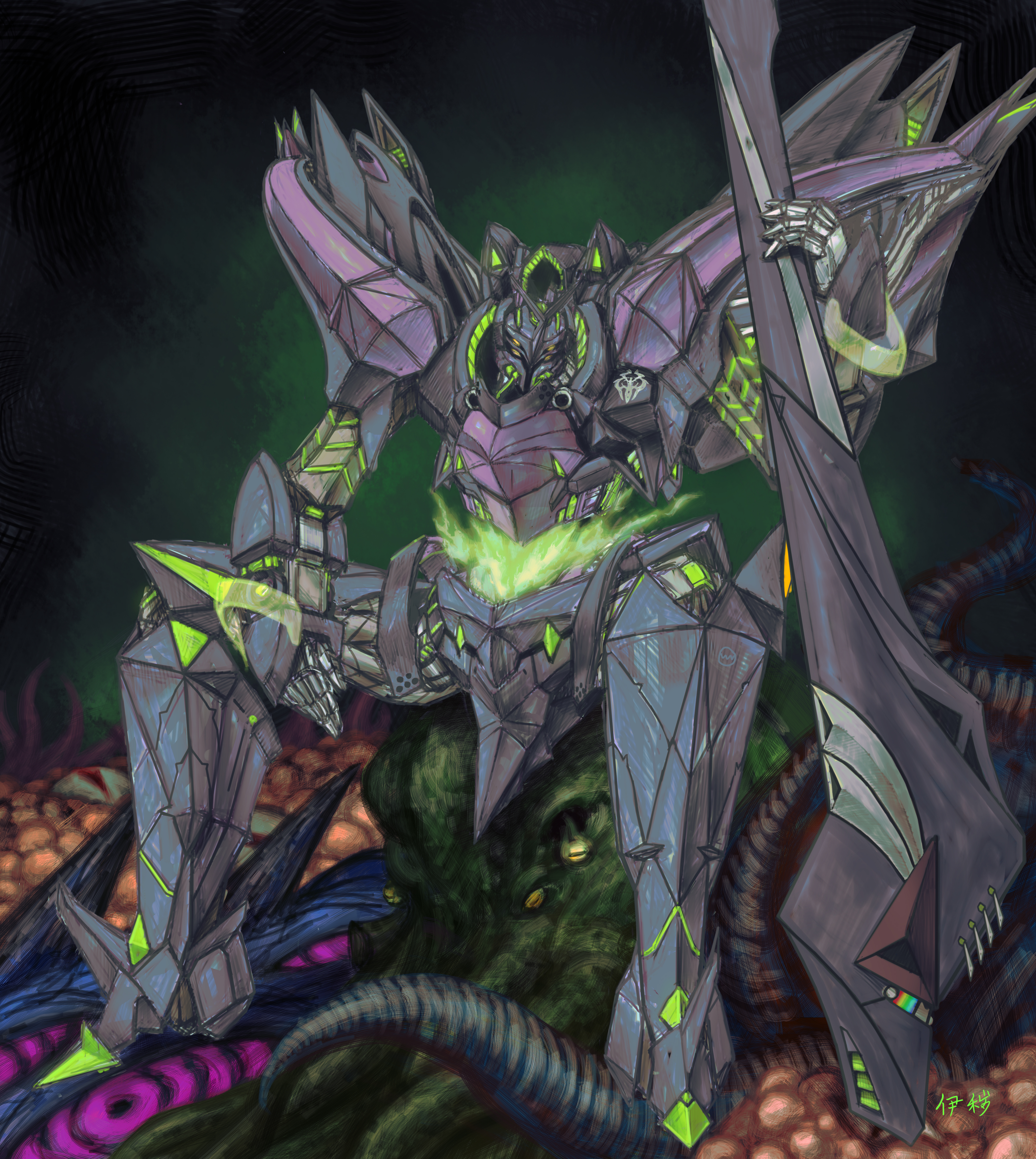 absurdres at_(iron_saga) chinese_commentary extra_eyes faux_traditional_media highres holding holding_weapon iron_saga looking_at_viewer mecha no_humans orange_eyes robot science_fiction sitting solo tentacles weapon yi_huizi