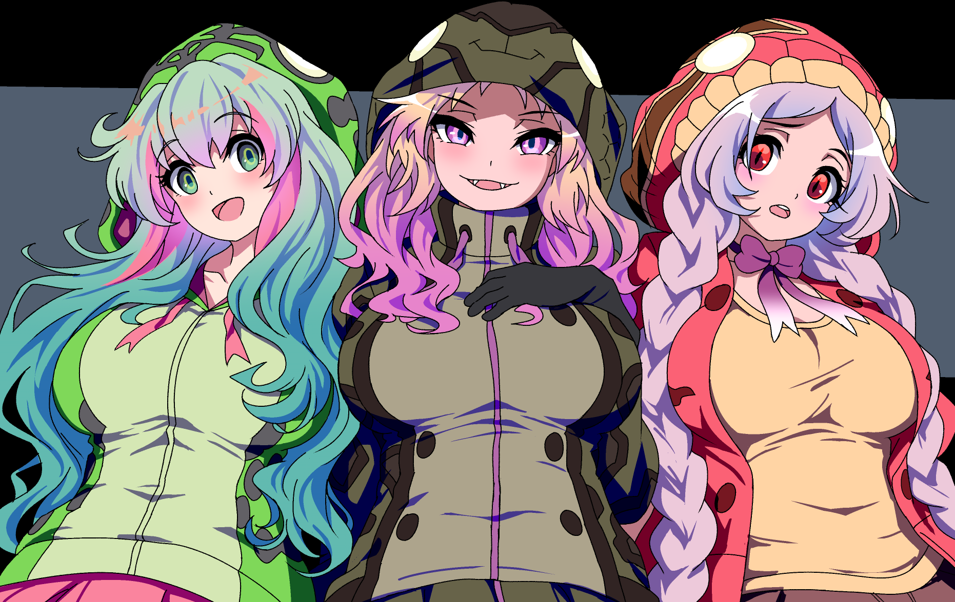 3girls :d african_rock_python_(kemono_friends) amazon_tree_boa_(kemono_friends) animal_print aqua_hair arm_behind_back arms_behind_back blonde_hair boomslang_(kemono_friends) bow bowtie braid breasts choker collarbone drawstring fangs gloves green_eyes green_hair hand_on_own_chest highres hood hood_up hooded_jacket jacket kemono_friends large_breasts long_hair long_sleeves looking_at_viewer mamiyama multicolored_hair multiple_girls open_clothes open_jacket open_mouth print_jacket purple_eyes purple_hair raised_eyebrow red_eyes red_hair shirt side-by-side skirt slit_pupils smile snake_print twin_braids upper_body very_long_hair