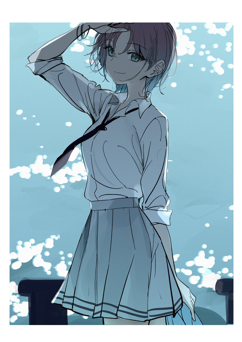 1girl aqua_eyes asakura_toru black_hair black_necktie blue_hair bracelet commentary gradient_hair grey_skirt highres idolmaster idolmaster_shiny_colors jewelry looking_at_viewer loose_necktie miniskirt multicolored_hair nakamura_rohane necktie parted_bangs pleated_skirt school_uniform shirt short_hair skirt sleeves_rolled_up solo white_shirt
