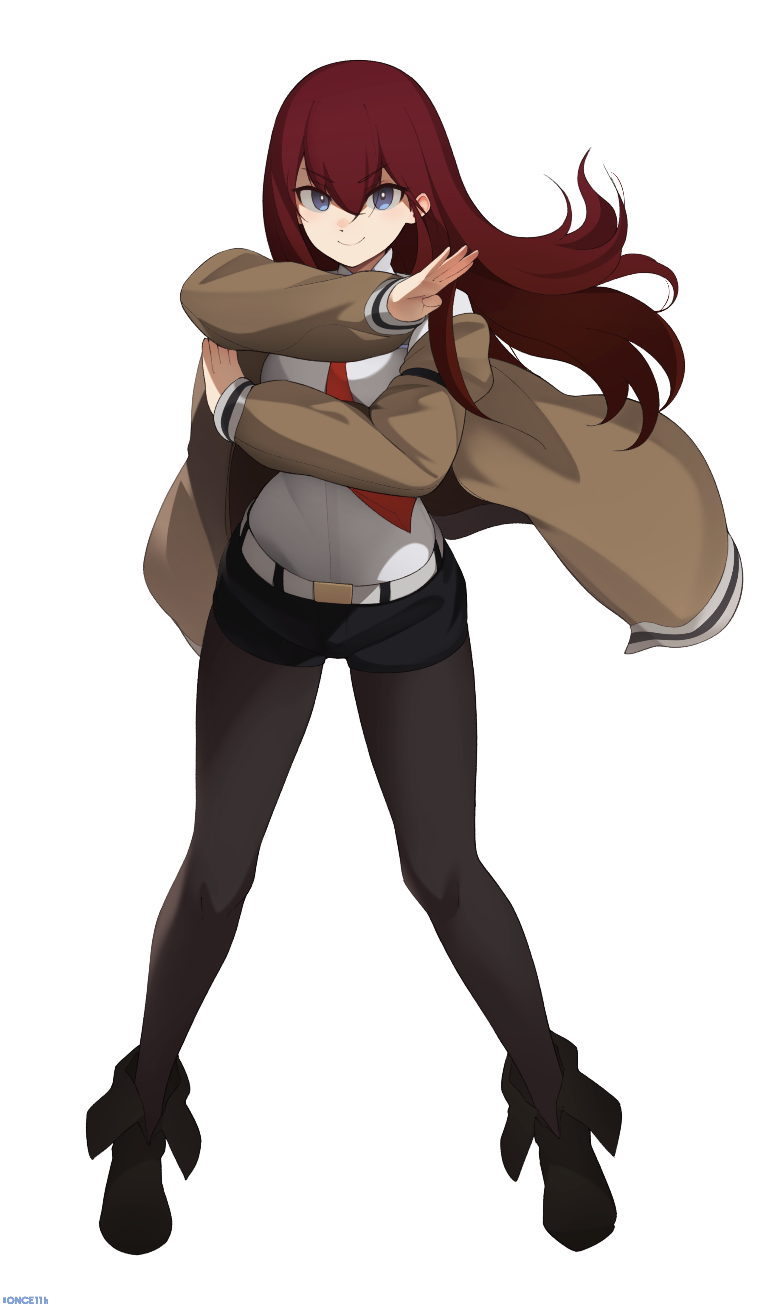 1girl absurdres belt black_boots black_pantyhose black_shorts blue_eyes boots closed_mouth commentary commission commissioner_upload dress_shirt full_body highres jacket lab_coat long_hair long_sleeves looking_at_viewer makise_kurisu necktie non-web_source once_11h open_clothes open_jacket pantyhose pantyhose_under_shorts red_hair red_necktie science_adventure shirt shorts signature simple_background smile solo standing steins;gate transparent_background white_shirt