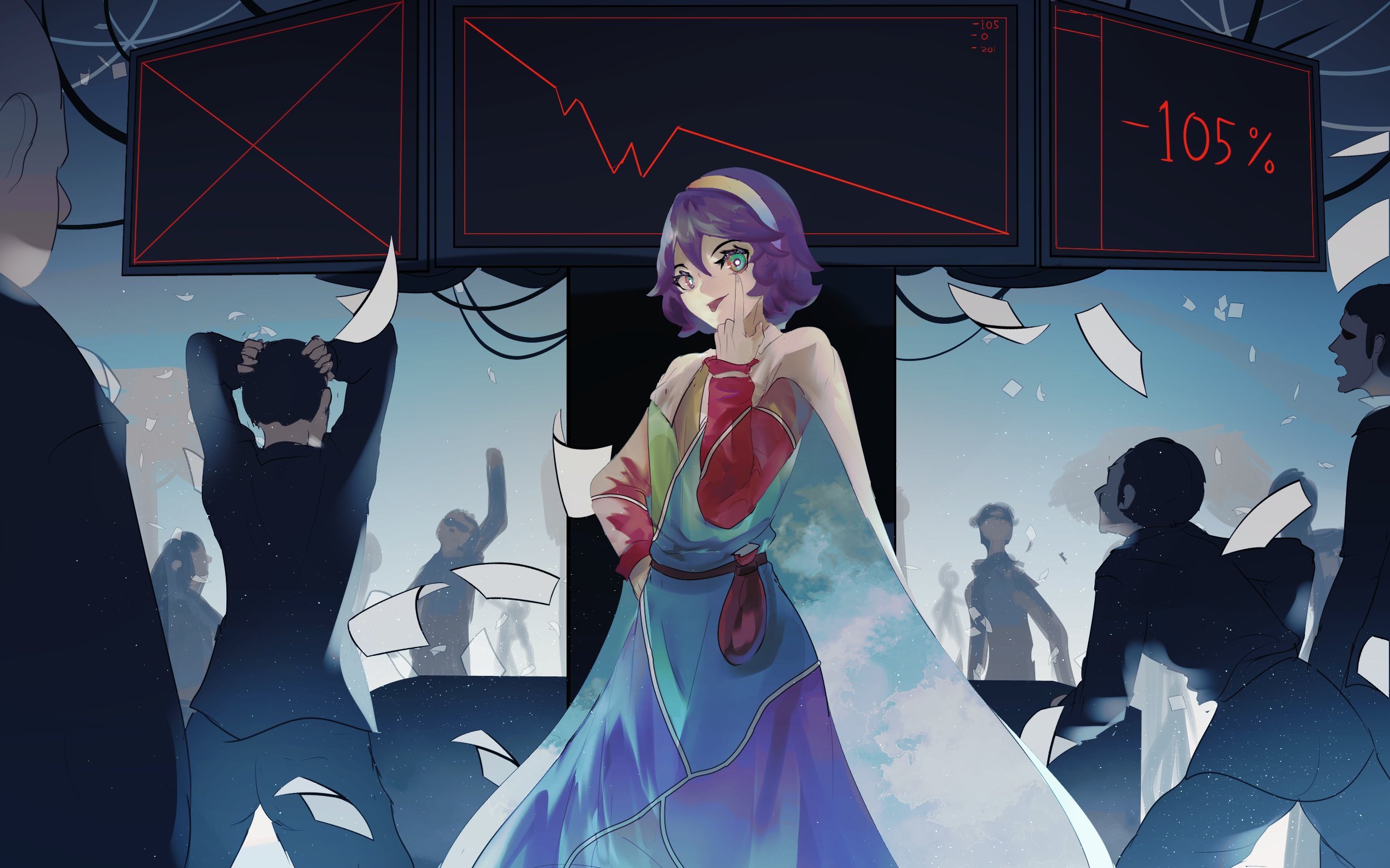 1girl 6+boys black_hair blue_eyes business_suit cape cloak commission dress formal_clothes hair_between_eyes hairband highres long_sleeves multicolored_dress multicolored_hairband multicolored_headwear multiple_boys naufaldreamer open_mouth panicking paper patchwork_clothes purple_hair rainbow_gradient salaryman screen short_hair sky_print stocks suit tenkyuu_chimata touhou