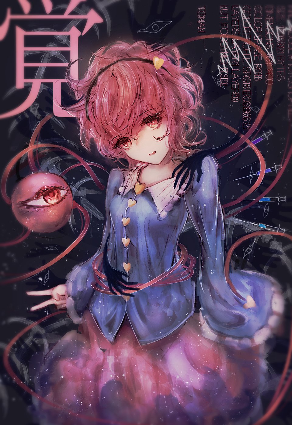 1girl arms_at_sides artist_name bad_id bad_pixiv_id bags_under_eyes black_hairband blouse blue_shirt breasts buttons commentary cowboy_shot frilled_shirt_collar frilled_sleeves frills hair_ornament hairband head_tilt heart heart_button heart_hair_ornament highres komeiji_satori long_sleeves messy_hair open_mouth pink_eyes pink_hair pink_skirt shirt short_hair skirt small_breasts smile solo syringe third_eye tonan_(l0l0l0l0l0l) touhou translated v wide_sleeves