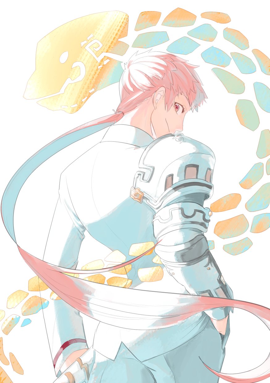1girl arm_armor armor back formal_clothes from_behind highres hisokanaki35 long_hair looking_at_viewer looking_back pink_eyes pink_hair ponytail smile solo standing suit taromaiti_(housamo) upper_body white_armor white_background white_suit