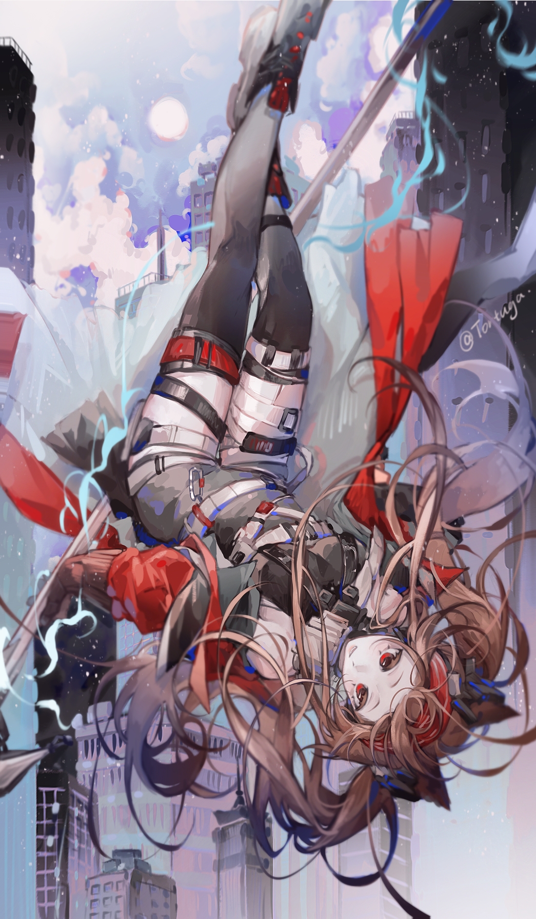 1girl bare_shoulders black_thighhighs blue_fire blurry blurry_background breasts brown_hair building city cloud commentary english_commentary falling fire highres legs long_hair medium_breasts parted_lips red_eyes shiguilinga solo sun thigh_strap thighhighs twintails twitter_username upside-down