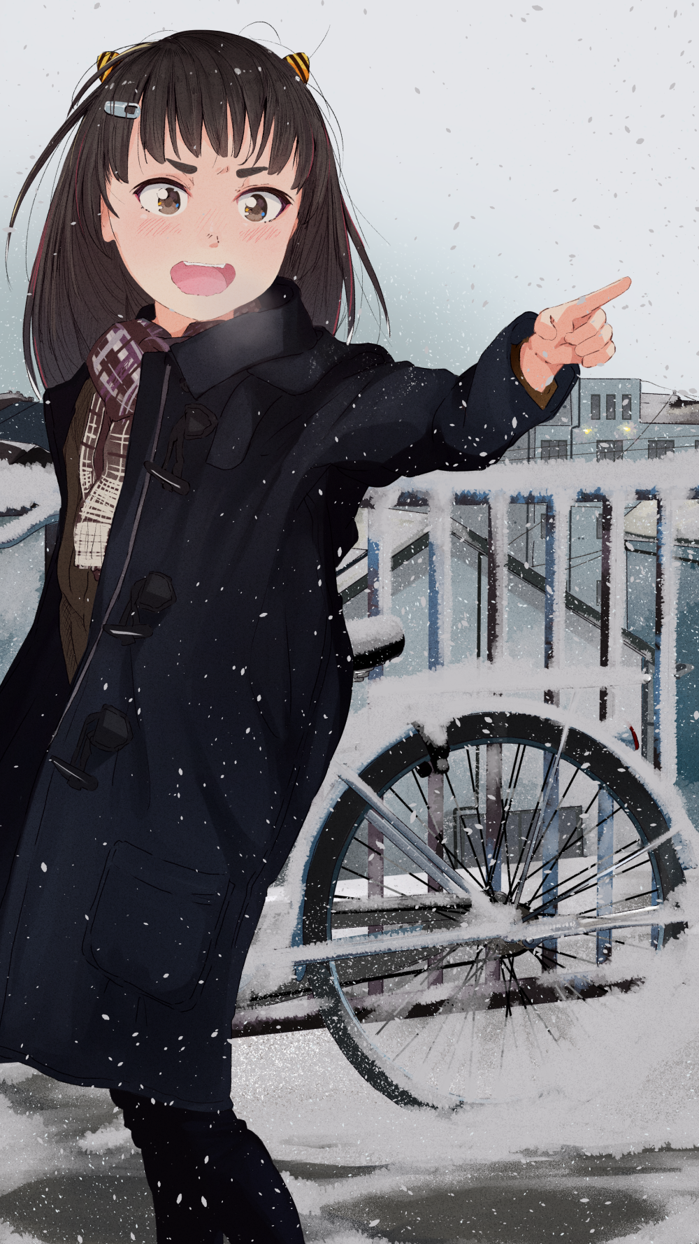 1girl bicycle black_coat blush brown_eyes brown_hair brown_sweater city clip_studio_paint_(medium) coat commentary_request feet_out_of_frame hair_ornament hairclip hand_up highres long_hair long_sleeves open_clothes open_coat open_mouth original outdoors pocket pointing red_scarf russian_commentary scarf servachok sky snow snowing solo sweater teeth upper_teeth_only wet_ground white_sky winter