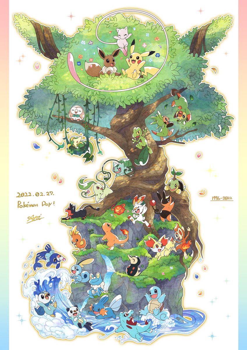 bulbasaur charmander chespin chikorita chimchar cyndaquil dated eevee fang fire flame-tipped_tail froakie gen_1_pokemon gen_2_pokemon gen_3_pokemon gen_4_pokemon gen_5_pokemon gen_6_pokemon gen_7_pokemon gen_8_pokemon grookey highres ichinoseyui leaf legendary_pokemon litten mew_(pokemon) mudkip mythical_pokemon nintendo no_humans oshawott petals pikachu plant pokemon pokemon_(creature) popplio rock rowlet scorbunny sitting smile snivy sobble squirtle starter_pokemon_trio swimming tail tepig torchic totodile tree treecko turtwig vines waves