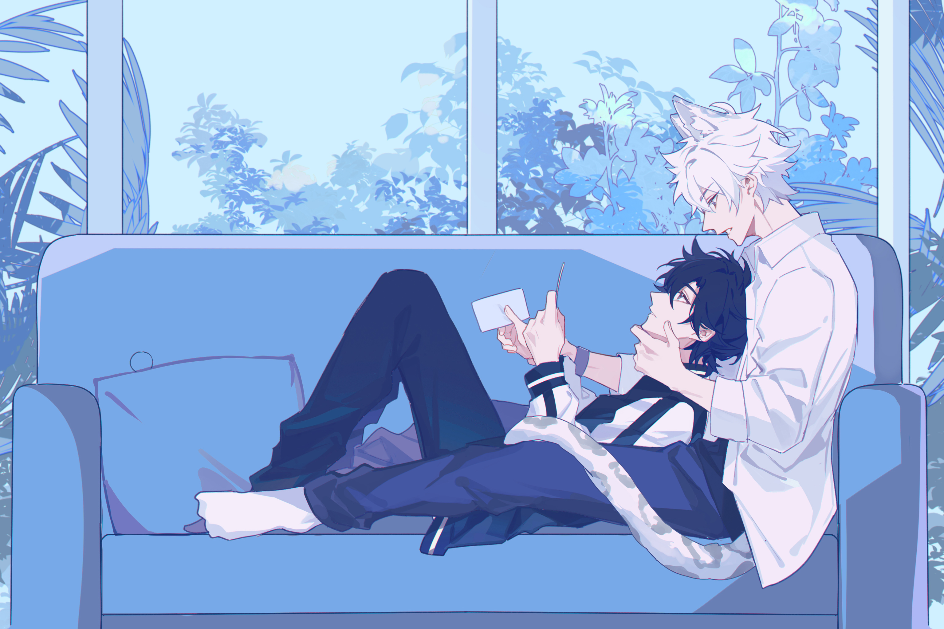2boys animal_ears black_hair black_jacket black_pants blue_theme brown_eyes camera cheng_xiaoshi chinese_commentary closed_mouth commentary_request couch feet_together from_side hand_on_another's_chin highres holding holding_paper indoors jacket leopard_boy leopard_ears leopard_tail long_sleeves looking_at_another lu_guang lying male_focus multiple_boys on_back on_couch open_clothes open_mouth open_shirt pants paper pillow plant shiguang_dailiren shirt short_hair sitting socks tail tail_around_own_leg white_jacket white_legwear white_shirt yaoi yellow_eyes yusa_(yusa0751)
