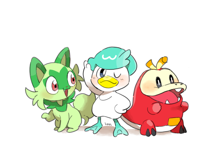 :d animal_focus arm_up ban_(ban62460424) blush closed_mouth commentary_request fang fuecoco nintendo no_humans one_eye_closed open_mouth pokemon pokemon_(creature) quaxly red_eyes smile sprigatito starter_pokemon_trio