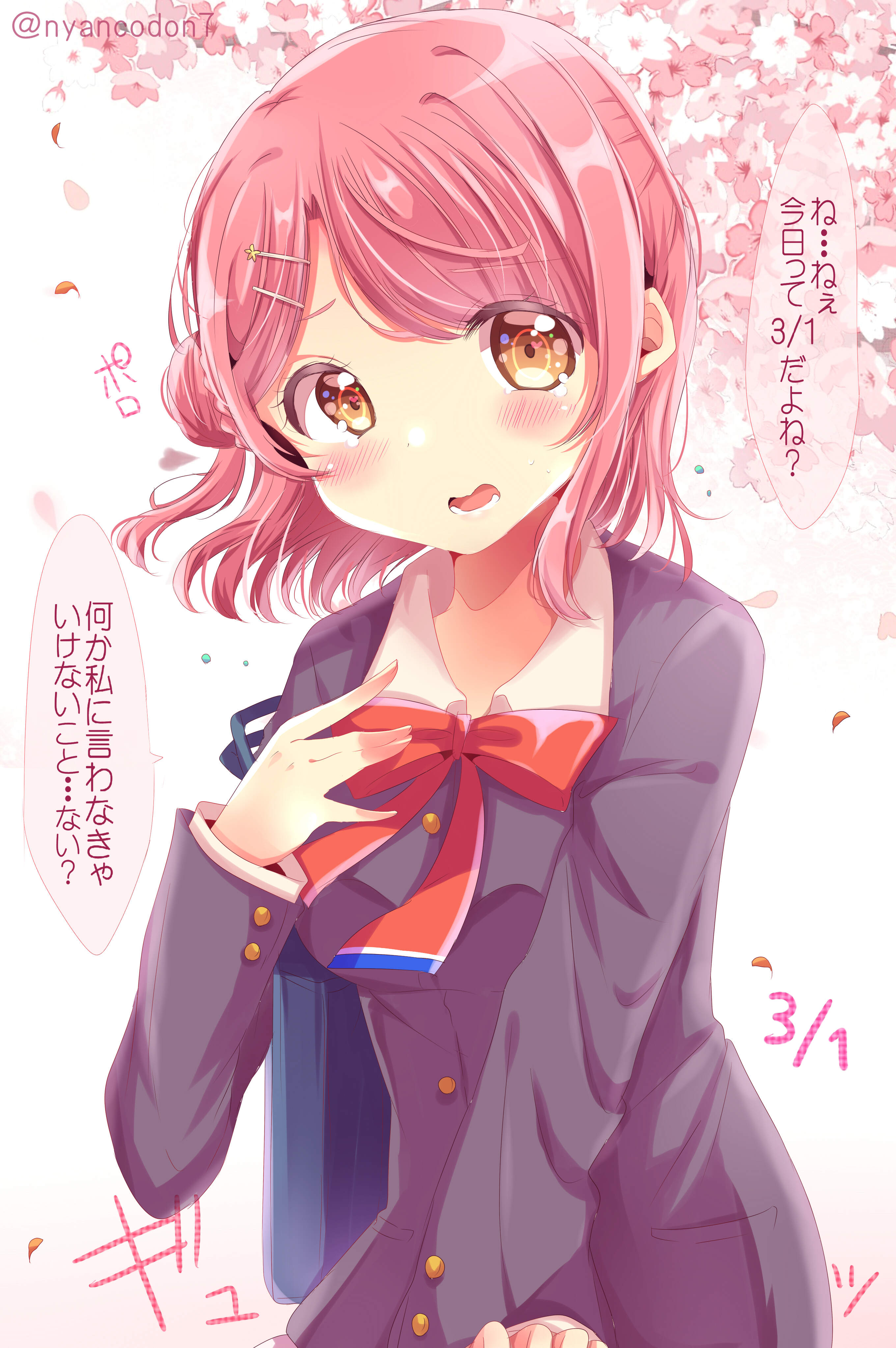 1girl absurdres artist_name artist_request black_cardigan black_jacket blush bow bowtie braid braided_bun breasts buttons cardigan check_translation close-up collared_shirt commentary_request dated female_focus floating_hair green_eyes hair_bun hair_ornament hairclip half_updo highres jacket long_sleeves looking_at_viewer love_live! love_live!_nijigasaki_high_school_idol_club nail_(hardware) nail_polish neck_ribbon nekomeron nijigasaki_school_uniform orange_hair parted_lips petals pink_petals red_bow red_hair red_ribbon ribbon school_uniform shirt short_hair side_bun single_hair_bun single_side_bun smile solo speech_bubble star_(symbol) star_hair_ornament translated translation_request uehara_ayumu upper_body wavy_hair white_background white_shirt yellow_eyes