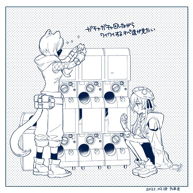 1boy 1girl animal_ears arknights coat dotted_background ear_piercing fishnet_sleeves fishnets gacha_(game_mechanic) gachapon_(object) gashapon hands_up hat high_tops holding hood hood_down mask mizuki_(arknights) mouth_mask piercing pouch shirayuki_(arknights) shoes short_hair short_hair_with_long_locks shorts sneakers socks sparkle squatting stoat_girl tail weasel_ears weasel_tail white_background zuncro_gb