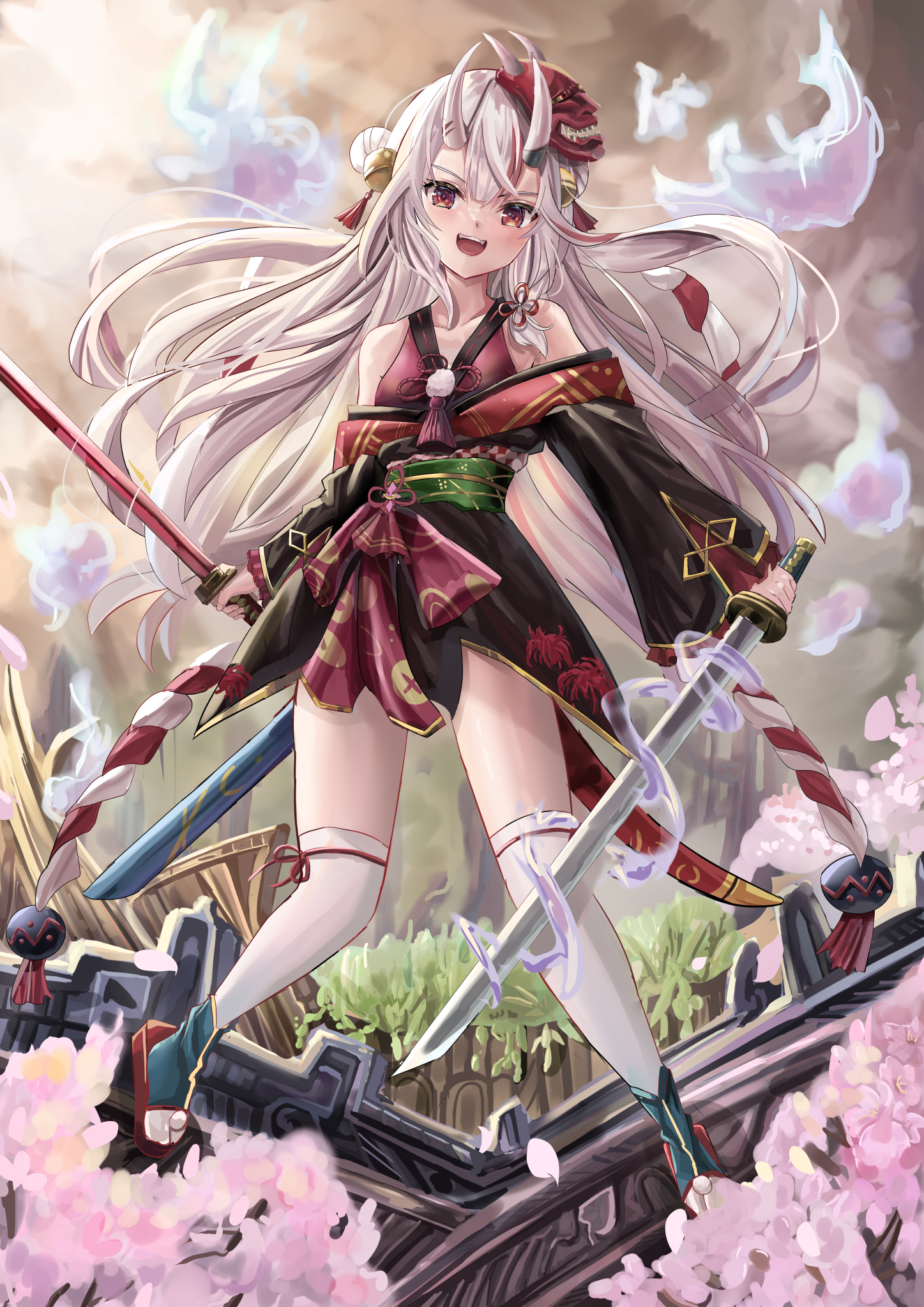 1girl bell black_kimono blush cherry_blossoms commentary_request double_bun dual_wielding floating_hair hair_bell hair_between_eyes hair_bun hair_ornament highres holding holding_sword holding_weapon hololive horns japanese_clothes jingle_bell kimono long_hair looking_at_viewer mask mask_on_head multicolored_hair nakiri_ayame nakiri_ayame_(1st_costume) obi off_shoulder oni_mask open_mouth outdoors red_eyes red_hair red_kimono sash shigiroid sidelocks skin-covered_horns streaked_hair sword thighhighs virtual_youtuber weapon white_hair white_thighhighs