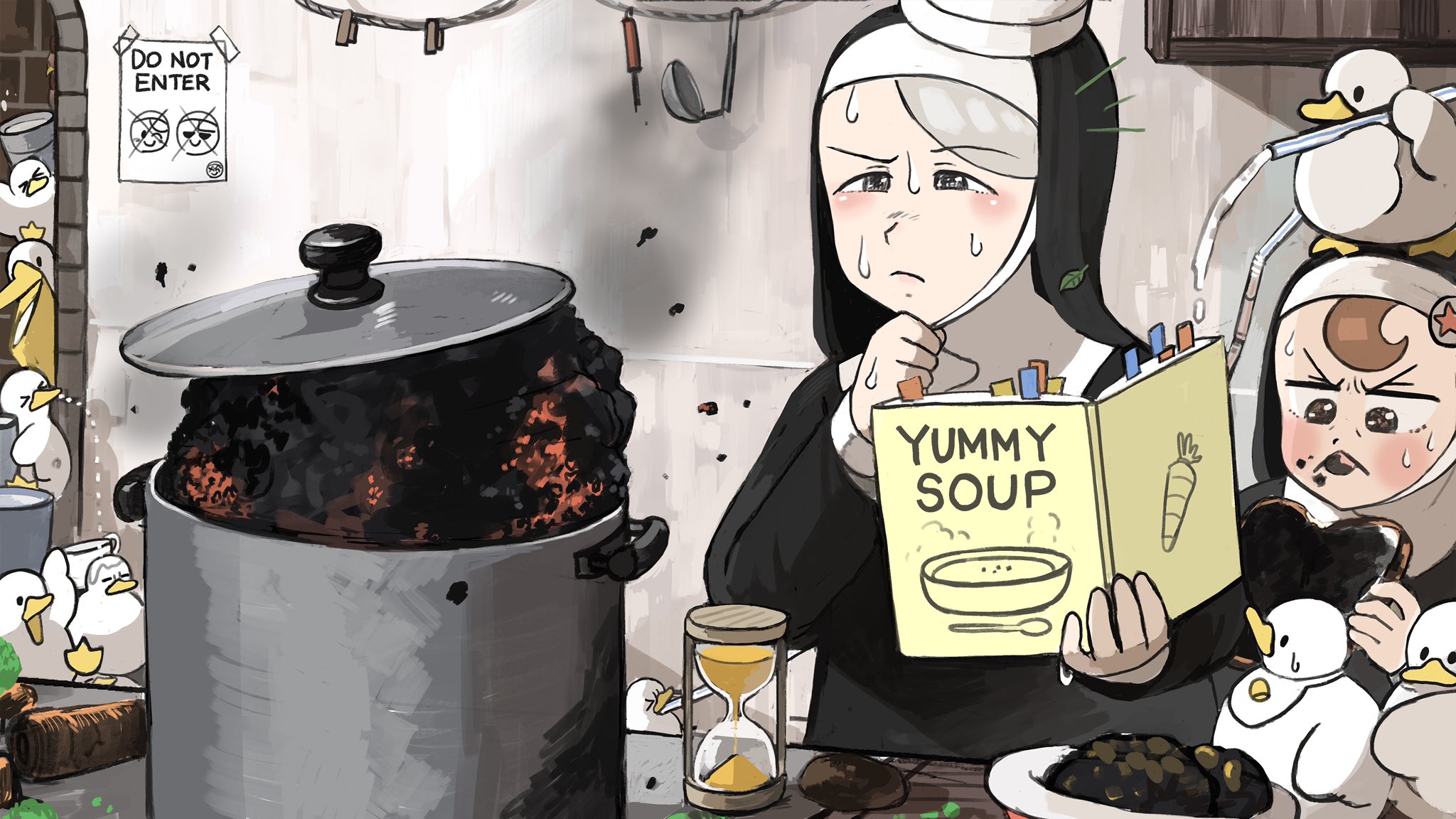 >_< 2girls :< bib bird book broken bucket burnt_food carrot chef_hat chicken corn cup diva_(hyxpk) doorway drinking_straw duck eating froggy_nun_(diva) hand_on_own_chin hat highres holding holding_book hourglass kitchen leaf_nun_(diva) little_nuns_(diva) multiple_girls nervous_sweating nun nun_headdress pelican poster_(object) pot potato recipe_(object) slice_of_life spitting sweat teacup traditional_nun water