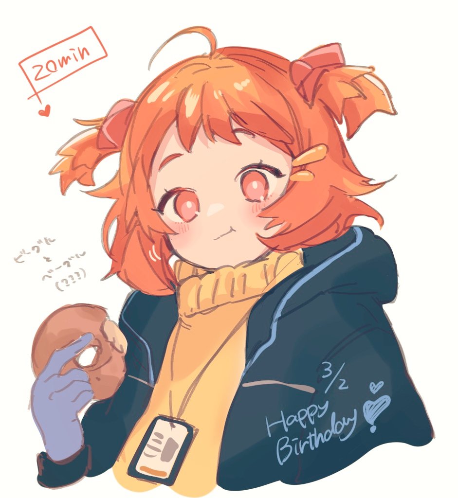 1girl :t ahoge arknights bagel beagle_(arknights) black_jacket blue_gloves blush completion_time eating food gloves hair_ornament hairclip hand_up happy_birthday heart holding holding_food id_card jacket looking_at_viewer mmm_ma_pmpm no_eyewear one-hour_drawing_challenge open_clothes open_jacket orange_eyes orange_hair orange_sweater short_hair simple_background solo sweater turtleneck turtleneck_sweater twintails upper_body white_background