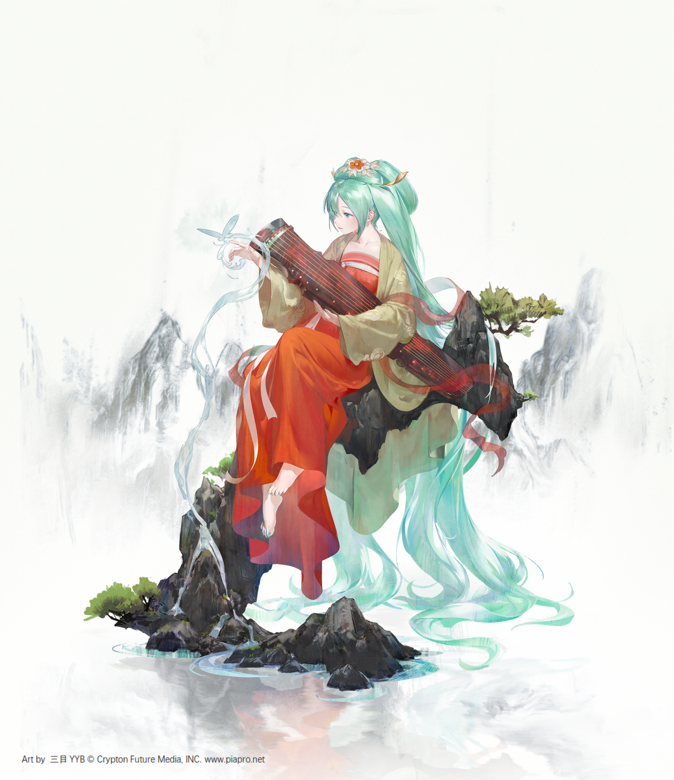absurdly_long_hair barefoot bug butterfly chinese_clothes copyright_name dress flower green_eyes green_hair hair_flower hair_ornament hair_spread_out hanfu hatsune_miku highres insect long_hair nail_polish official_art qixiong_ruqun red_dress red_flower shaped_liquid simple_background sitting solo tagme tree twintails very_long_hair vocaloid water yyb