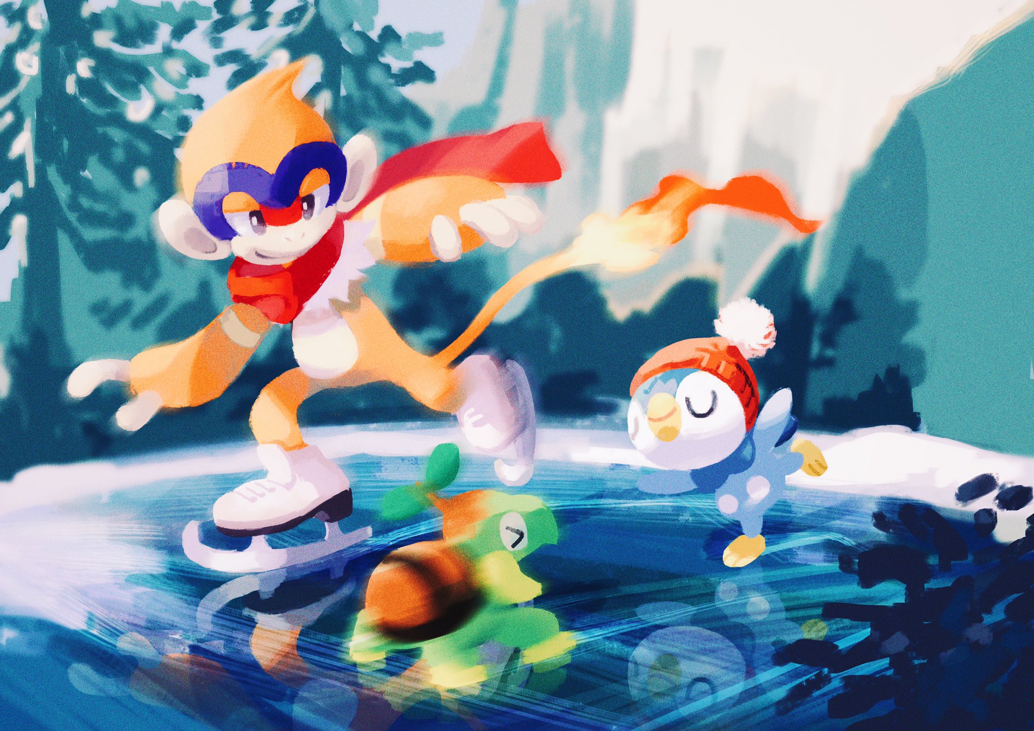 >_< beanie closed_eyes closed_mouth clothed_pokemon commentary_request day floating_scarf gen_4_pokemon grey_eyes hat hemhemhoo highres ice ice_skates ice_skating monferno nintendo open_mouth orange_headwear outdoors piplup pokemon pokemon_(creature) red_scarf reflection scarf skates skating smile turtwig u_u