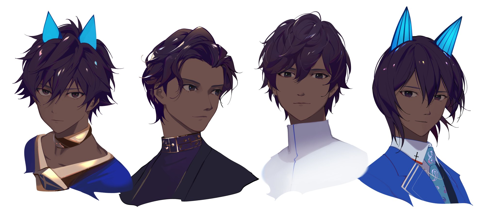 4boys :| arjuna_(fate) arjuna_(traveling_outfit)_(fate) arjuna_(versus)_(fate) arjuna_alter_(fate) arjuna_alter_(student_council_president)_(fate) asian_indian_clothes bishounen black_eyes black_hair blue_horns blue_jacket clone closed_mouth collared_shirt dark-skinned_male dark_skin expressionless fate/grand_order fate_(series) formal_clothes glowing_horns highres horns jacket light_smile long_sleeves looking_at_viewer male_focus multiple_boys multiple_persona multiple_views official_alternate_costume pisu portrait school_uniform shirt short_hair simple_background suit white_background white_shirt