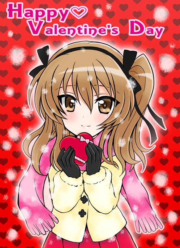 1girl balloon black_gloves black_ribbon box brown_eyes brown_hair casual closed_mouth coat commentary english_commentary english_text gift girls_und_panzer gloves hair_ribbon happy_valentine heart heart-shaped_box heart_balloon holding holding_gift kuromori_yako long_hair long_sleeves looking_at_viewer mixed-language_commentary one_side_up pleated_skirt purple_scarf red_skirt ribbon scarf shimada_arisu skirt smile snowing solo standing valentine winter_clothes yellow_coat