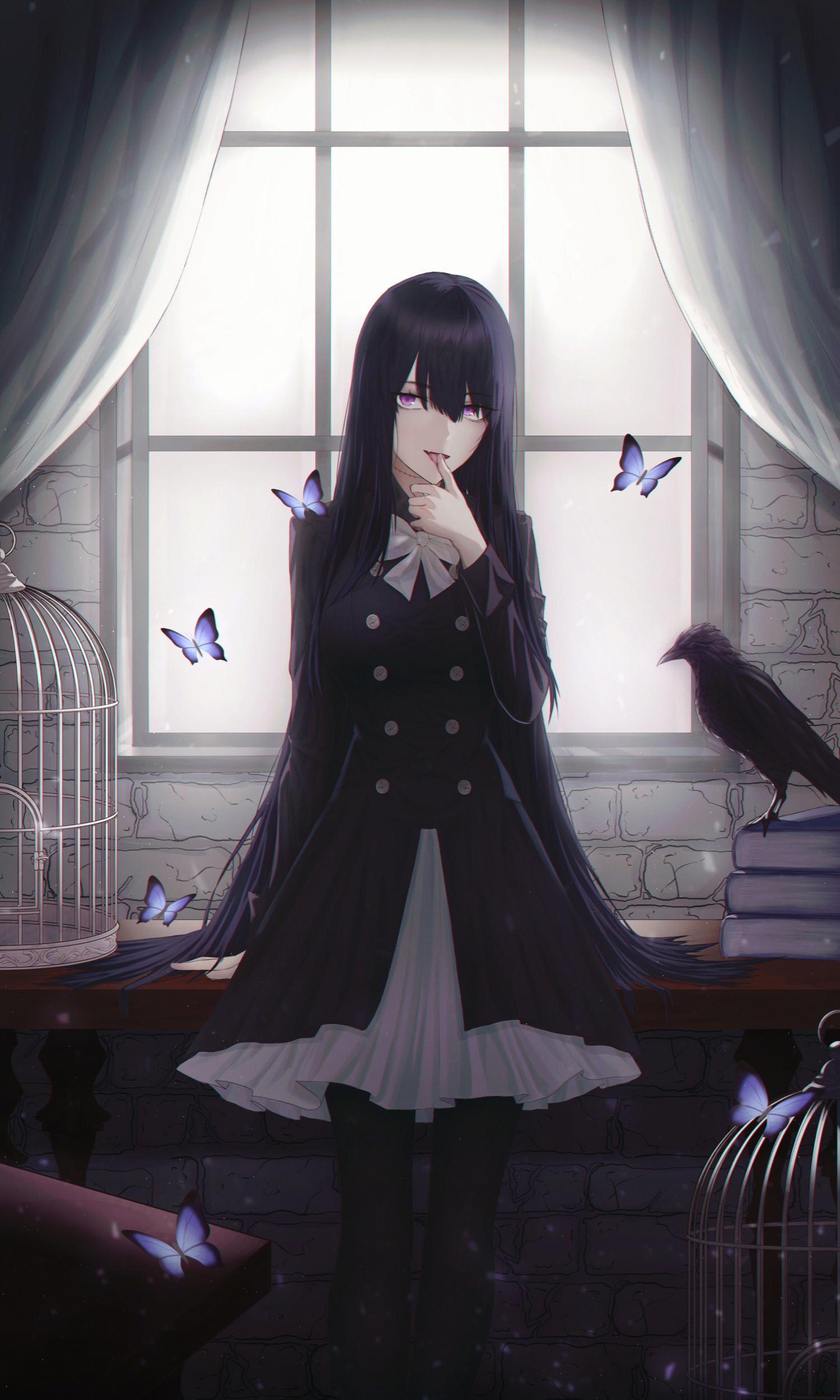1girl :p absurdres bird birdcage black_hair black_pantyhose breasts bug butterfly cage chromatic_aberration crow fang hair_between_eyes hayron highres insect licking licking_finger long_hair looking_at_viewer original pantyhose purple_eyes skin_fang skirt solo stitched_neck stitches tongue tongue_out very_long_hair white_skirt window