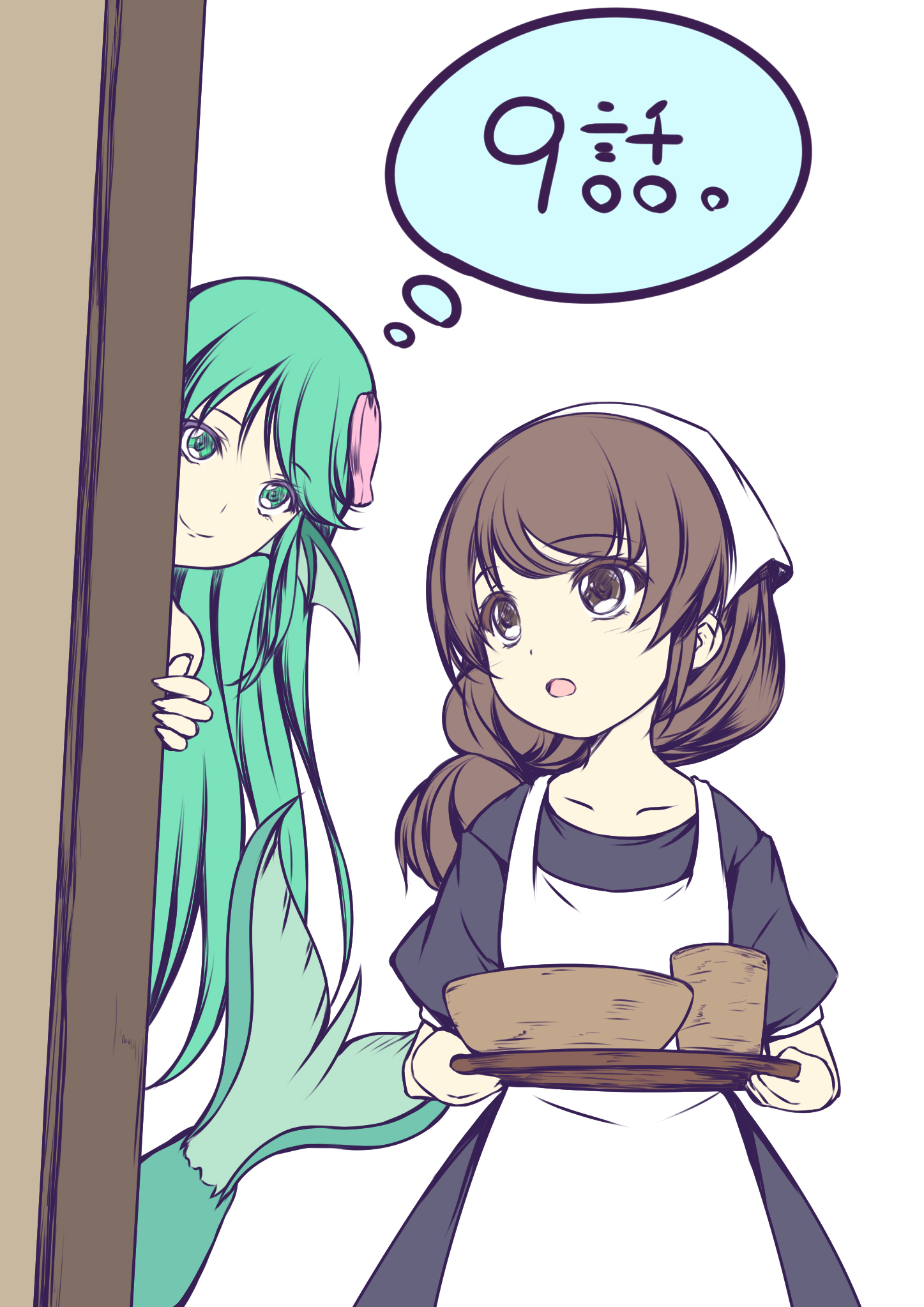 2girls :o animal_hair_ornament apron black_dress bowl braid brown_eyes brown_hair child closed_mouth collarbone colored_eyelashes cowboy_shot cup dot_nose dress episode_number eye_contact fins fish_hair_ornament fish_tail flat_color foreshortening green_eyes green_hair green_tail hair_ornament hand_up hands_up head_fins headscarf highres holding holding_tray leadale_no_daichi_nite light_blush long_hair looking_at_another looking_to_the_side lytt mermaid mimily monster_girl multiple_girls official_art open_mouth peeking_out puffy_short_sleeves puffy_sleeves short_sleeves side_braid single_braid smile speech_bubble split_mouth standing swept_bangs tail tareme tenmaso thick_eyelashes thought_bubble tray unfinished uniform waitress white_apron white_background white_headscarf white_headwear