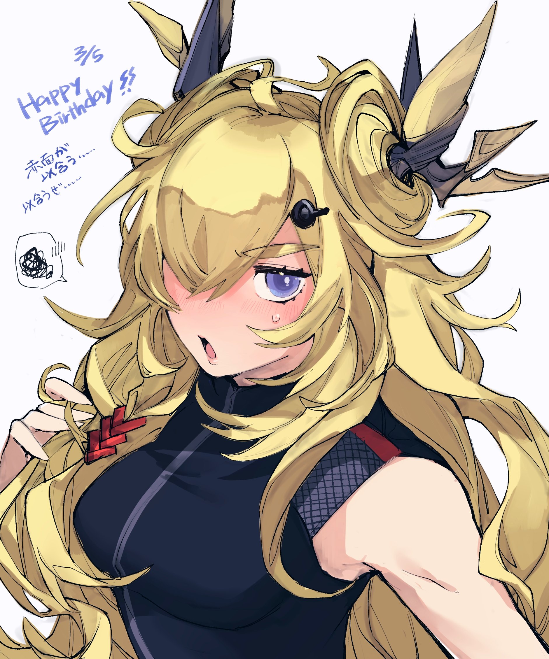 1girl arknights bare_shoulders black_shirt blonde_hair blue_eyes breasts dated double_bun dragon_horns hair_bun hair_ornament hair_over_one_eye hairclip happy_birthday highres horns leizi_(arknights) lips medium_breasts mmm_ma_pmpm open_mouth shirt simple_background solo spoken_squiggle squiggle sweatdrop thick_eyebrows upper_body v-shaped_eyebrows white_background