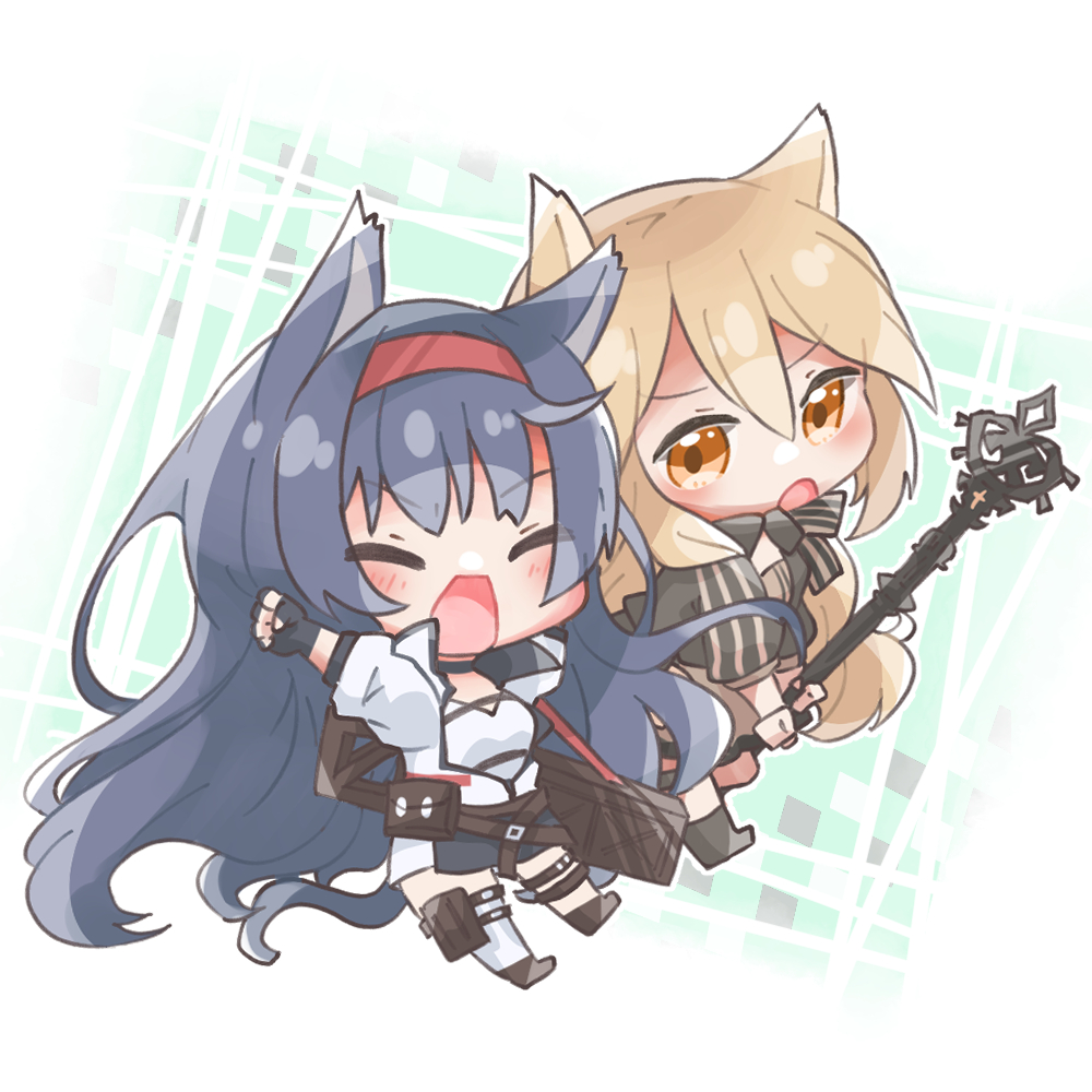 2girls animal_ears arknights blaze_(arknights) blonde_hair blue_eyes blue_hair breeze_(arknights) cat_ears cat_tail chibi female_focus fingerless_gloves fox_ears gloves hair_ornament hand_up light_blush long_hair midzuchi multiple_girls open_mouth simple_background tail yellow_eyes