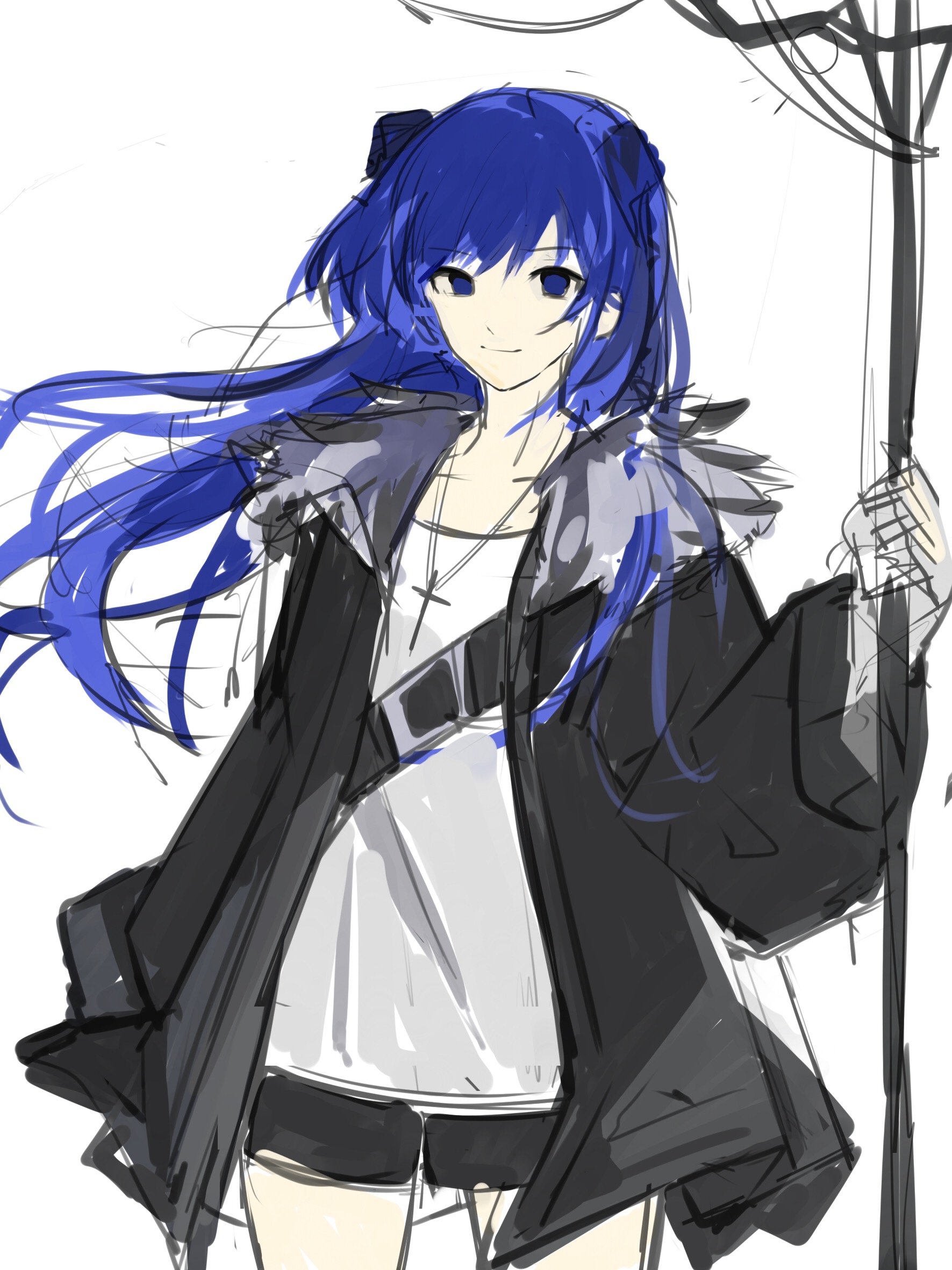1girl arknights black_halo black_jacket black_shorts blouse blue_eyes blue_hair collarbone cowboy_shot cross cross_necklace dark_halo demon_horns dumenggu fur-trimmed_jacket fur_trim halo highres holding holding_staff horns jacket jewelry long_hair long_sleeves looking_at_viewer mostima_(arknights) necklace open_clothes open_jacket shirt short_shorts shorts simple_background sketch smile solo staff unfinished white_background white_shirt wind