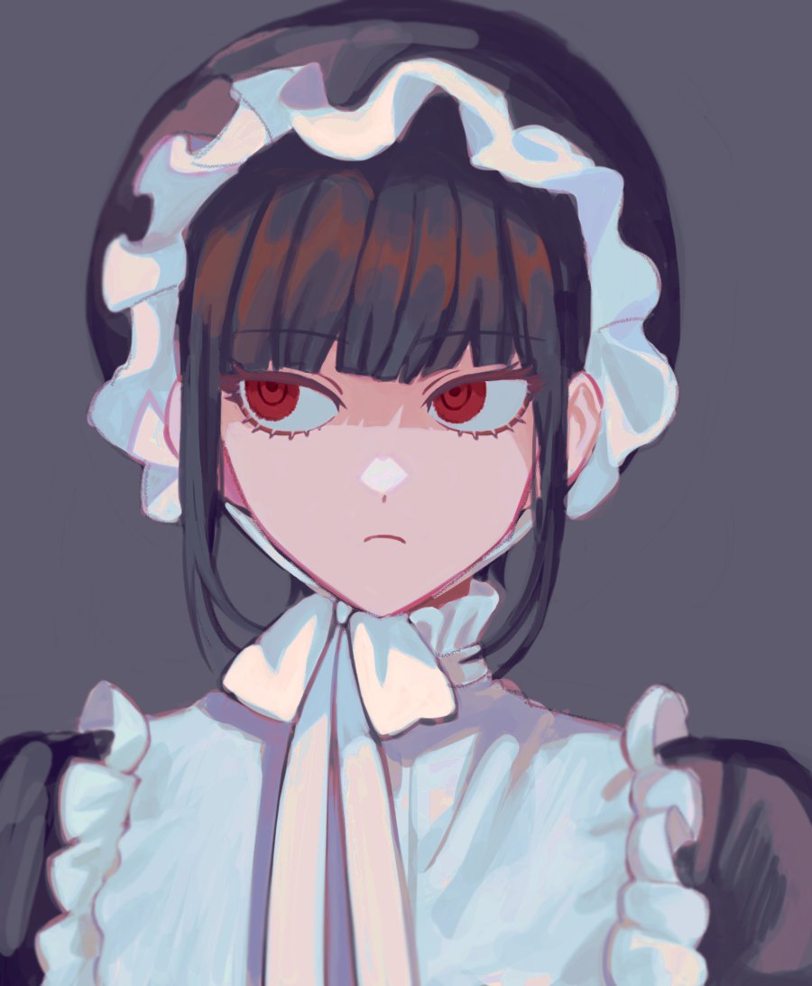 1girl alternate_costume alternate_hair_length alternate_hairstyle black_shirt bong_(0u0bon) celestia_ludenberg closed_mouth danganronpa:_trigger_happy_havoc danganronpa_(series) frills frown grey_background hood hood_up portrait red_eyes ribbon shirt sideways_glance simple_background solo white_ribbon