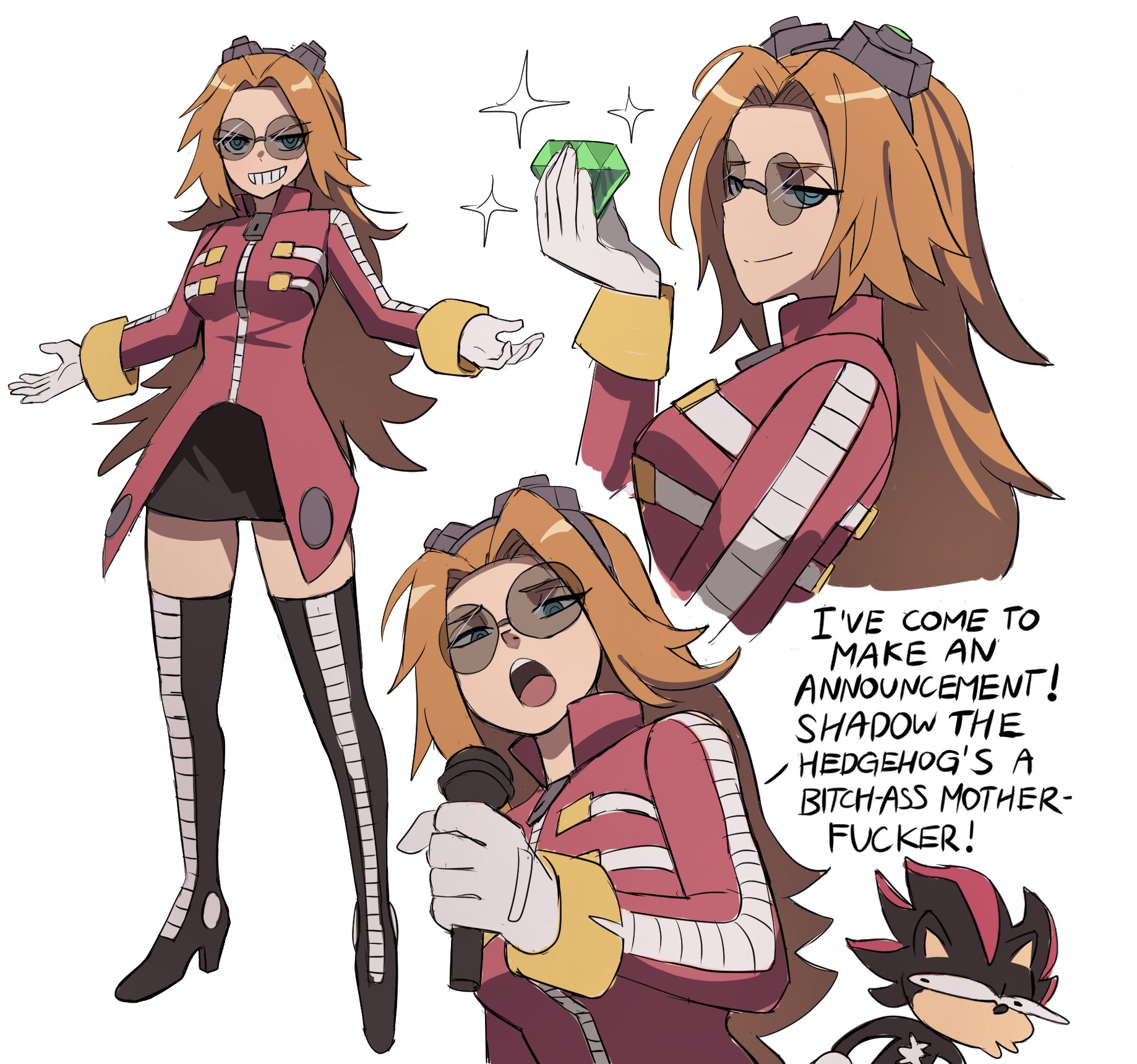 1girl artist_name black_skirt black_thighhighs blue_eyes boots breasts brown_hair dr._eggman eggma'am english_text gem genderswap genderswap_(mtf) glasses gloves goggles goggles_on_head green_gem grin half-closed_eyes highres holding holding_jewelry jacket jewelry jourd4n long_hair long_sleeves looking_at_viewer meme microphone open_mouth profanity round_eyewear shadow_the_hedgehog simple_background skirt smile smirk sonic_(series) sunglasses surprised tagme teeth thighhighs tinted_eyewear very_long_hair white_background white_gloves zipper_pull_tab
