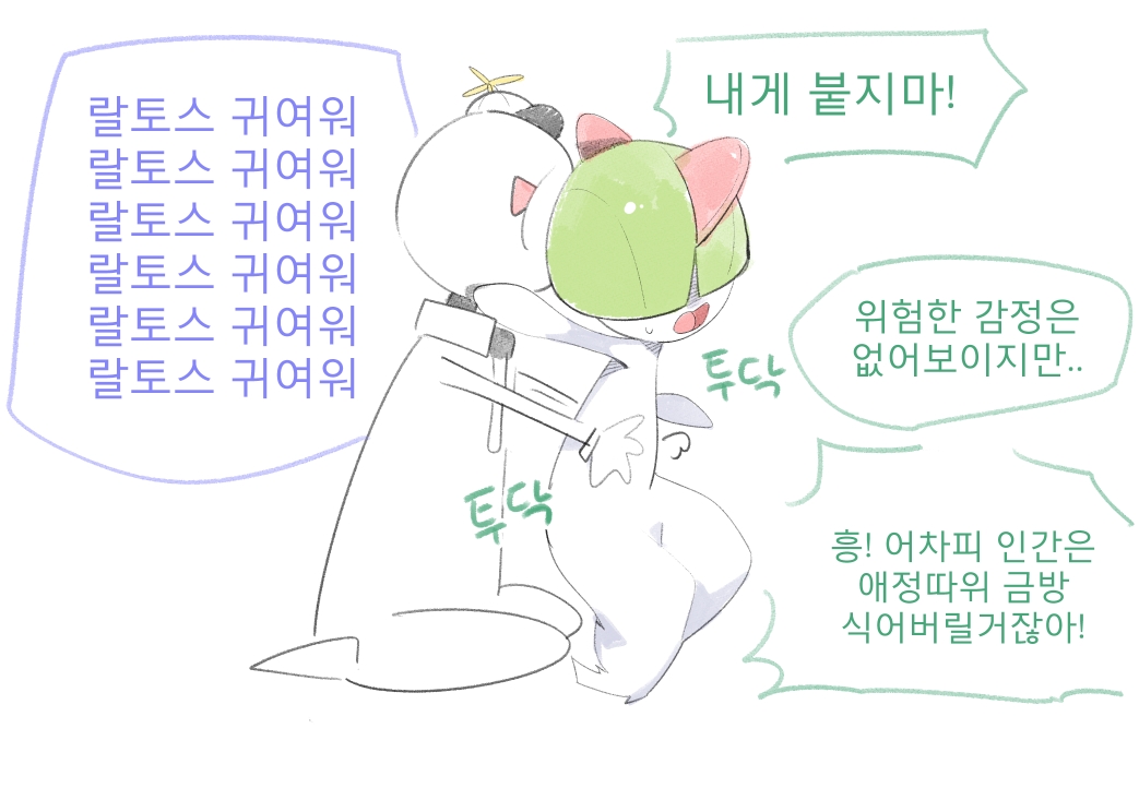 1boy 1girl arm_up blunt_bangs bowl_cut carrying cheek_press child colored_skin covered_eyes faceless faceless_male flat_chest from_side full_body gen_3_pokemon green_hair gu_deulmok hair_over_eyes happy hug hug_from_behind korean_text nintendo open_mouth outstretched_arm pokemon pokemon_(creature) propeller_hat ralts short_hair simple_background sitting sketch smile speech_bubble sweat talking text_focus translation_request turn_pale white_background white_skin