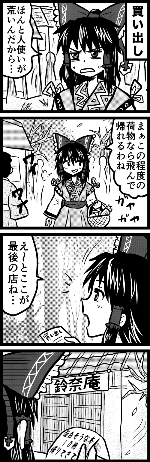 1girl basket black_hair cosplay enokuma_uuta greyscale hakurei_reimu highres monochrome morichika_rinnosuke morichika_rinnosuke_(cosplay) people shop short_hair speech_bubble touhou translation_request tree village