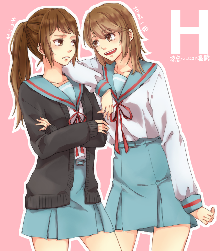 2girls :d arm_on_another's_shoulder belt black_cardigan blue_sailor_collar blue_skirt brown_eyes brown_hair cardigan character_name collarbone commentary_request copyright_name crossed_arms genderswap genderswap_(mtf) kita_high_school_uniform koizumi_itsuki_(female) kyonko long_hair long_sleeves looking_at_another multiple_girls open_cardigan open_clothes open_mouth pink_background ponytail red_ribbon ribbon ryuse156tamaki sailor_collar school_uniform serafuku skirt smile suzumiya_haruhi_no_yuuutsu teeth translation_request upper_teeth_only