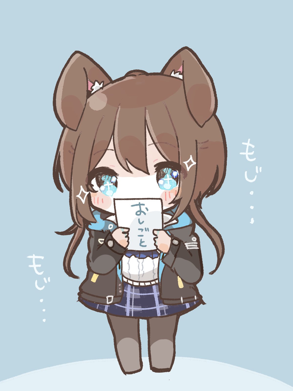 +_+ 1girl amiya_(arknights) animal_ear_fluff animal_ears arknights black_jacket black_pantyhose blue_background blue_eyes blue_skirt blush_stickers brown_hair commentary_request covered_mouth full_body highres holding hood hood_down hooded_jacket jacket long_hair long_sleeves looking_at_viewer mom2 no_shoes open_clothes open_jacket pantyhose plaid_clothes plaid_skirt rabbit_ears shirt skirt sleeves_past_wrists solo sparkle standing translation_request white_shirt