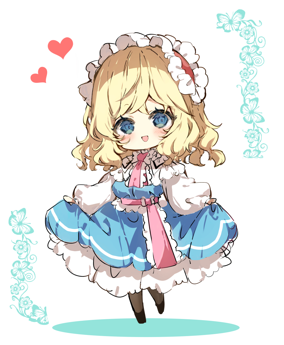 1girl alice_margatroid blonde_hair blue_dress blue_eyes blush clothes_lift dress dress_lift frilled_dress frills full_body hairband heart holding_own_dress lifting_own_clothes lolita_hairband long_sleeves open_mouth piyokichi red_hairband short_hair smile solo touhou white_background