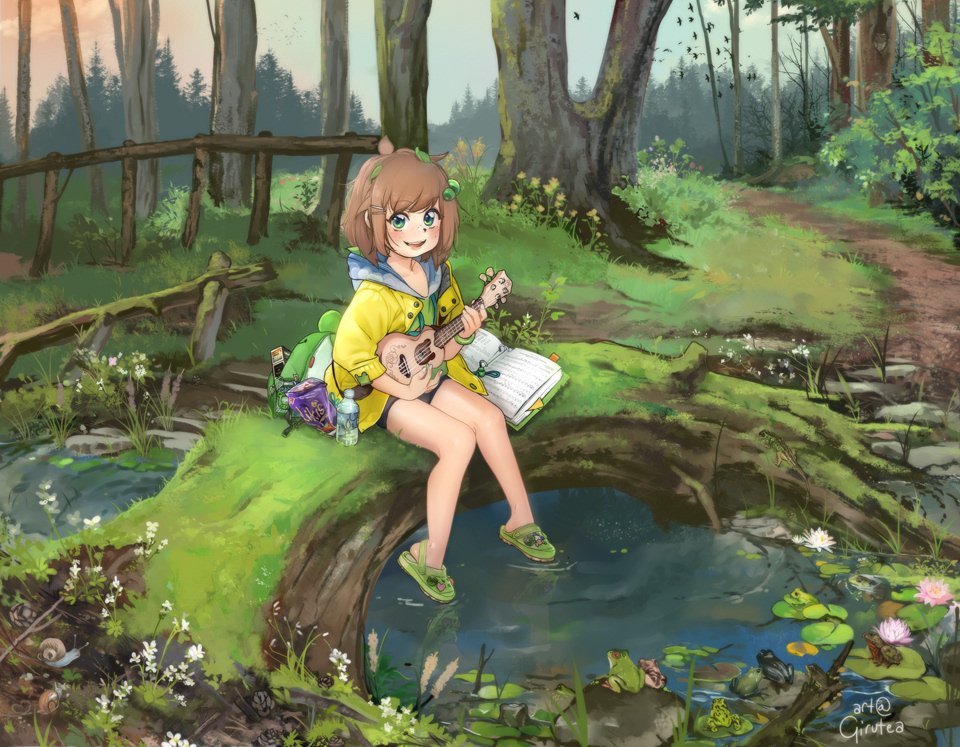 1girl ahoge alternate_costume backpack bag black_shorts blue_eyes blue_sky blush book bottle brown_hair coat collared_shirt crocs dirt dirt_road flower freckles frog from_above full_body girutea grass green_eyes green_shirt hooded_shirt indie_virtual_youtuber instrument jacket leaf leaf_on_head leaves_on_hair legs legs_apart lily_(flower) lily_hopkins lily_pad log looking_at_viewer moss nature notebook open_mouth outdoors paper pond road sheet_music shirt shorts sky smile snack snail teeth tongue tree ukulele upper_teeth_only virtual_youtuber water water_bottle wooden_post yellow_coat yellow_jacket