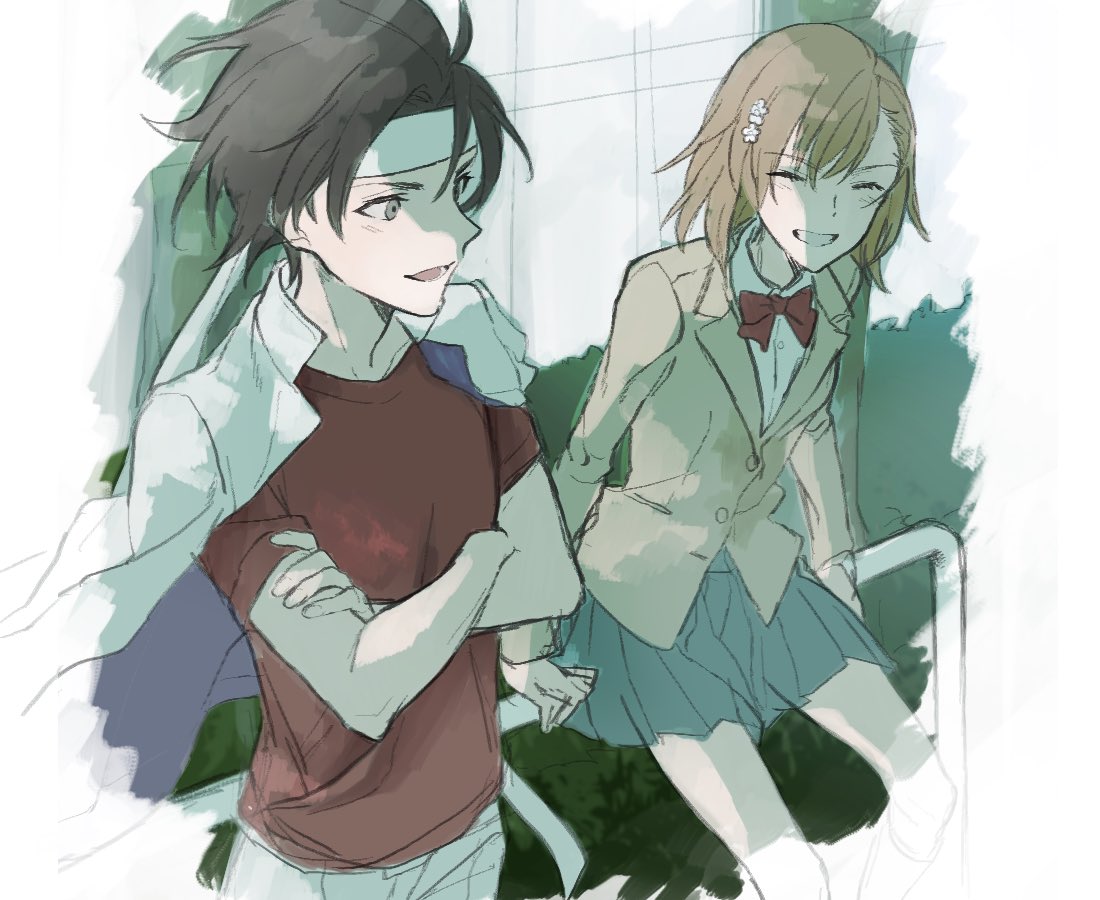 1boy 1girl artist_request brown_hair closed_eyes grin hair_ornament hairclip jacket misaka_mikoto school_uniform short_hair sitting smile sogiita_gunha toaru_kagaku_no_railgun toaru_majutsu_no_index tokiwadai_school_uniform