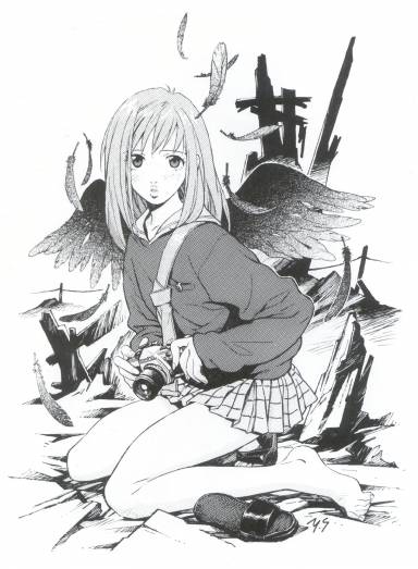 00s 1girl angel angel_wings barefoot camera feathers feet female_focus flcl greyscale kneeling miniskirt monochrome outdoors plaid_clothes plaid_skirt ruins sadamoto_yoshiyuki samejima_mamimi sandals school_uniform serafuku skirt solo wings