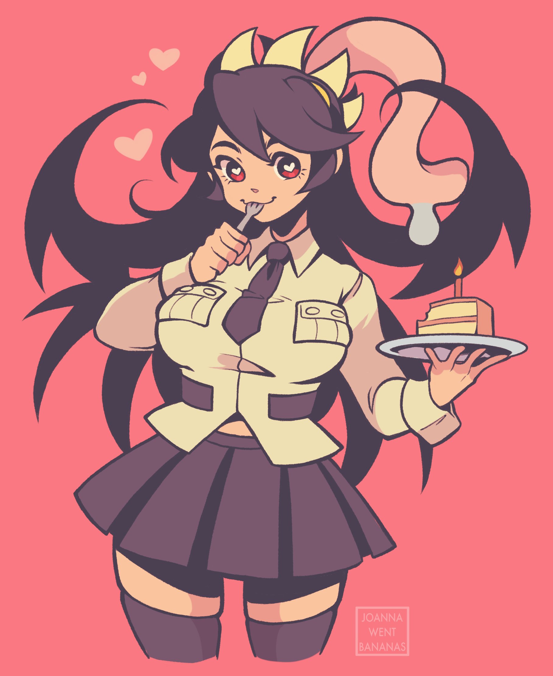 1girl birthday birthday_cake cake cake_slice candle cowboy_shot drooping eating filia_(skullgirls) food fork heart heart-shaped_pupils highres joanna_went_bananas long_hair necktie pink_background plate pleated_skirt samson_(skullgirls) school_uniform skirt skullgirls smile solo symbol-shaped_pupils thighhighs tongue tongue_out