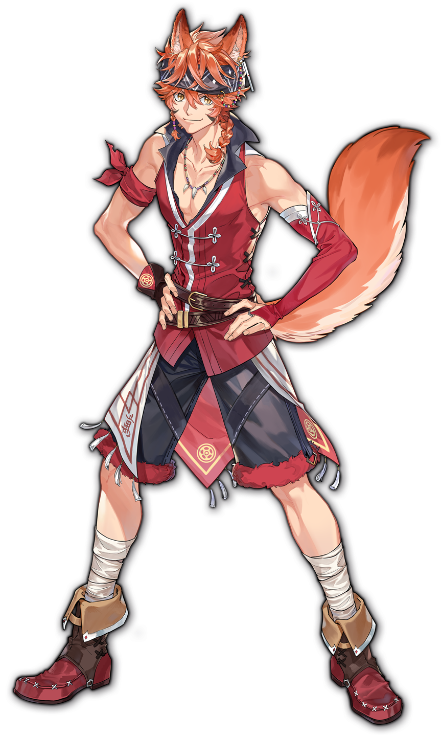 1boy animal_ears artist_request bandana belt blonde_hair boots braid braided_ponytail brown_belt brown_gloves collarbone detached_sleeves ein_(mahjong_soul) facial_mark fingerless_gloves fox_boy fox_ears fox_tail game_cg gloves hair_between_eyes highres jewelry mahjong mahjong_soul necktie orange_hair shorts side_ponytail simple_background smile solo standing tail tenbou third-party_source transparent_background