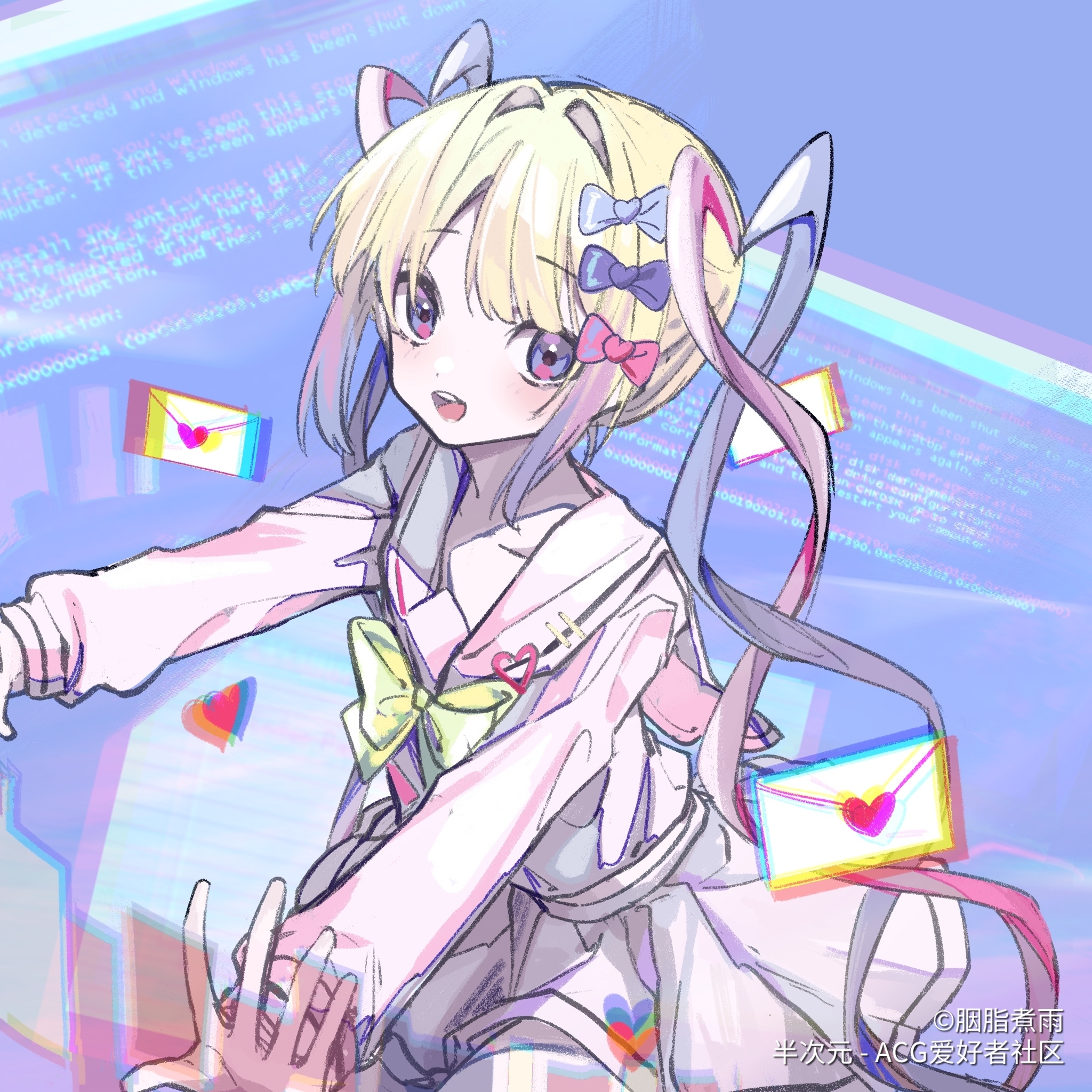 1girl blue_screen_of_death bow chouzetsusaikawa_tenshi-chan chromatic_aberration hair_bow hair_intakes highres iridescent_clothes iridescent large_bow letter looking_at_viewer love_letter multiple_hair_bows needy_girl_overdose onga open_mouth purple_eyes quad_tails silver_hair solo teeth upper_teeth_only