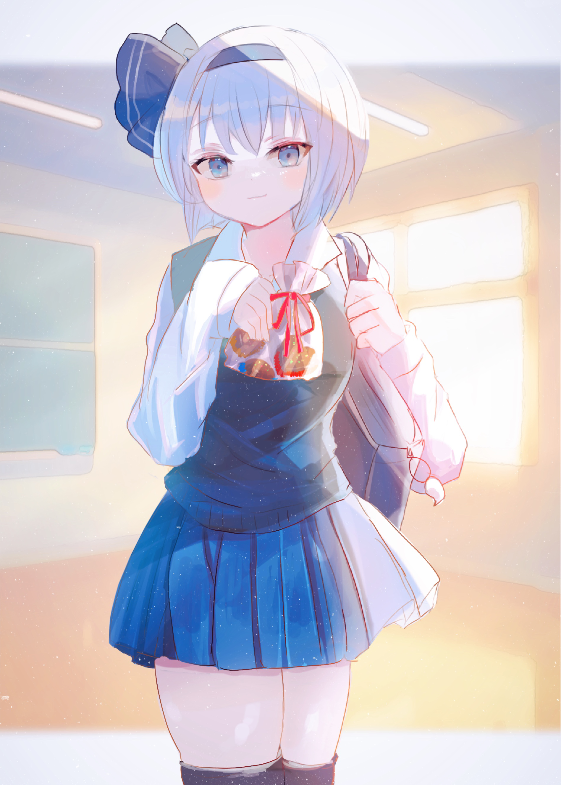 1girl absurdres backpack bag black_bow black_hairband black_ribbon blue_eyes blue_skirt bob_cut bow breasts candy classroom collared_shirt food green_vest hair_ribbon hairband highres ke-a-ru konpaku_youmu oversized_object ribbon shirt short_hair silver_hair simple_background skirt small_breasts solo touhou vest wavy_mouth white_background white_shirt