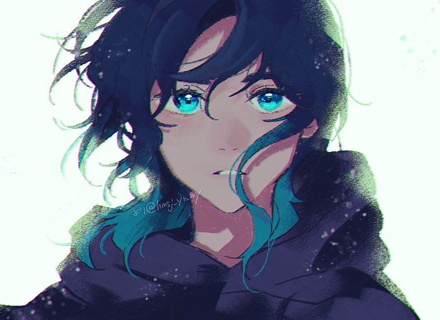 1boy black_hair blue_hair gradient_hair hmsj_yr_my hood hood_down hoodie leonardo_(taiso_samurai) long_hair looking_at_viewer multicolored_hair simple_background solo taiso_samurai twitter_username upper_body white_background