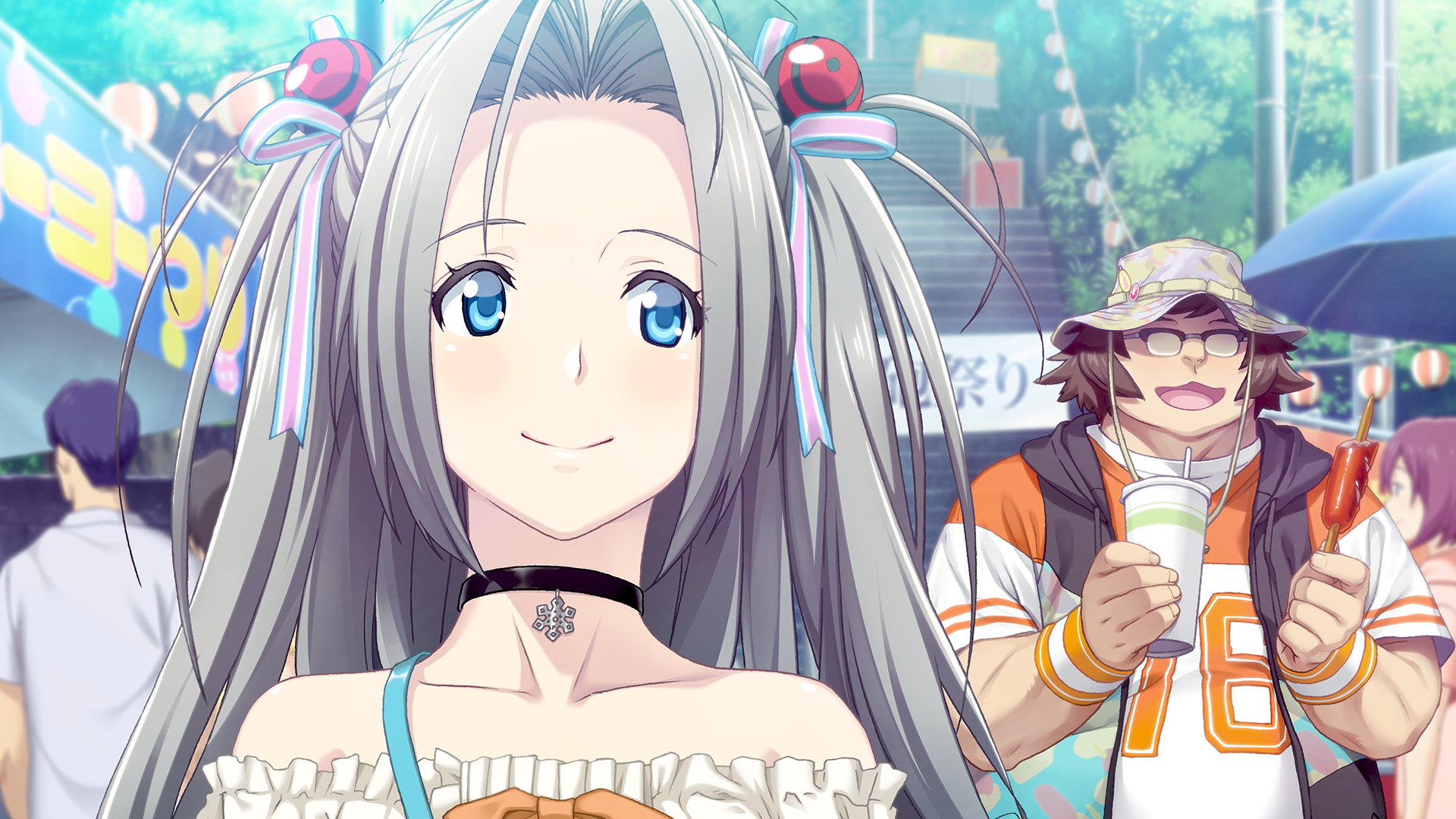 2girls 3boys blue_eyes boonie_hat brown_hair collar glasses grey_hair hashida_itaru highres multiple_boys multiple_girls off_shoulder robotics;notes robotics;notes_dash science_adventure yukifune_airi