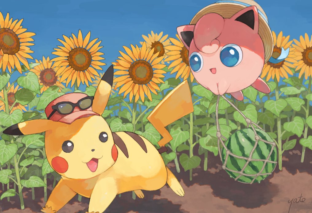 :d black-framed_eyewear blue_eyes clear_sky clothed_pokemon commentary_request day flower food fruit gen_1_pokemon happi_xfyg happy hat holding jigglypuff leaf nintendo no_humans open_mouth outdoors pikachu pokemon pokemon_(creature) running signature sky smile sunflower sunglasses tongue watermelon